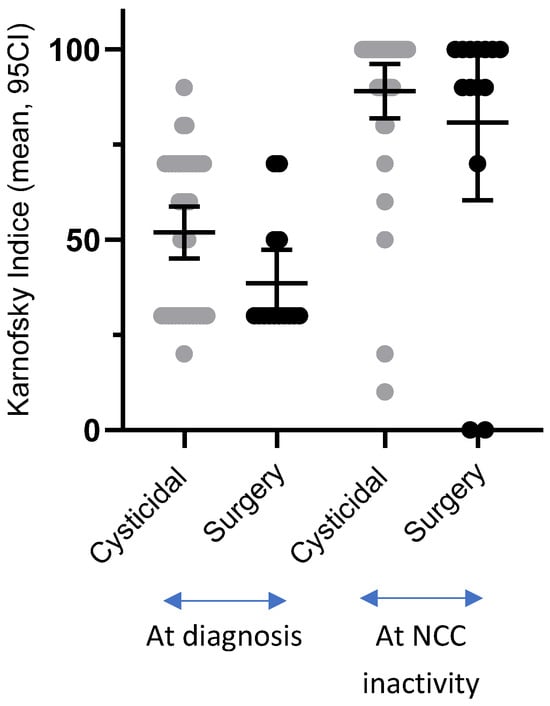 At the time of inactivity, most patients in both groups were asymptomatic (64.86% in the cysticidal group and 64.28% in the surgical group, p = 1, Table 6). Their functionality (KI), which was reduced at the time of diagnosis in both groups, but more notably in the surgical group (p = 0.04), had increased significantly when disease inactivity was achieved. This was true in both groups, with no significant difference between them (p = 0.513). The individual evolution of KI values and the dispersion of functional outcomes in both treatment groups are illustrated in Figure 4.