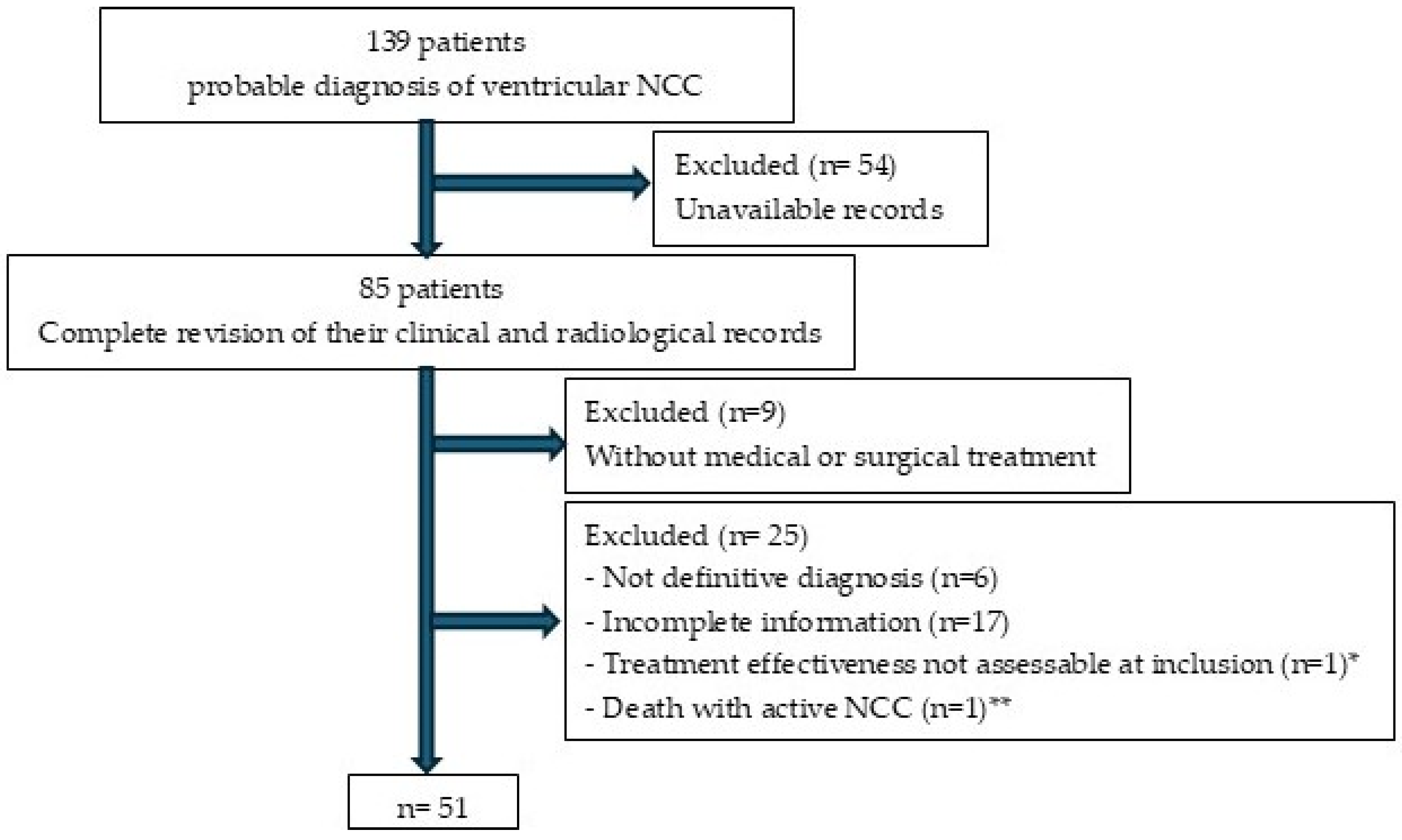 | Inclusion criteria | Age ≥ 18 years; definitive diagnosis of NCC according to accepted criteria [14,15]; intraventricular localization; available clinical and neuroimaging follow-up until disease inactivity; complete medical records |