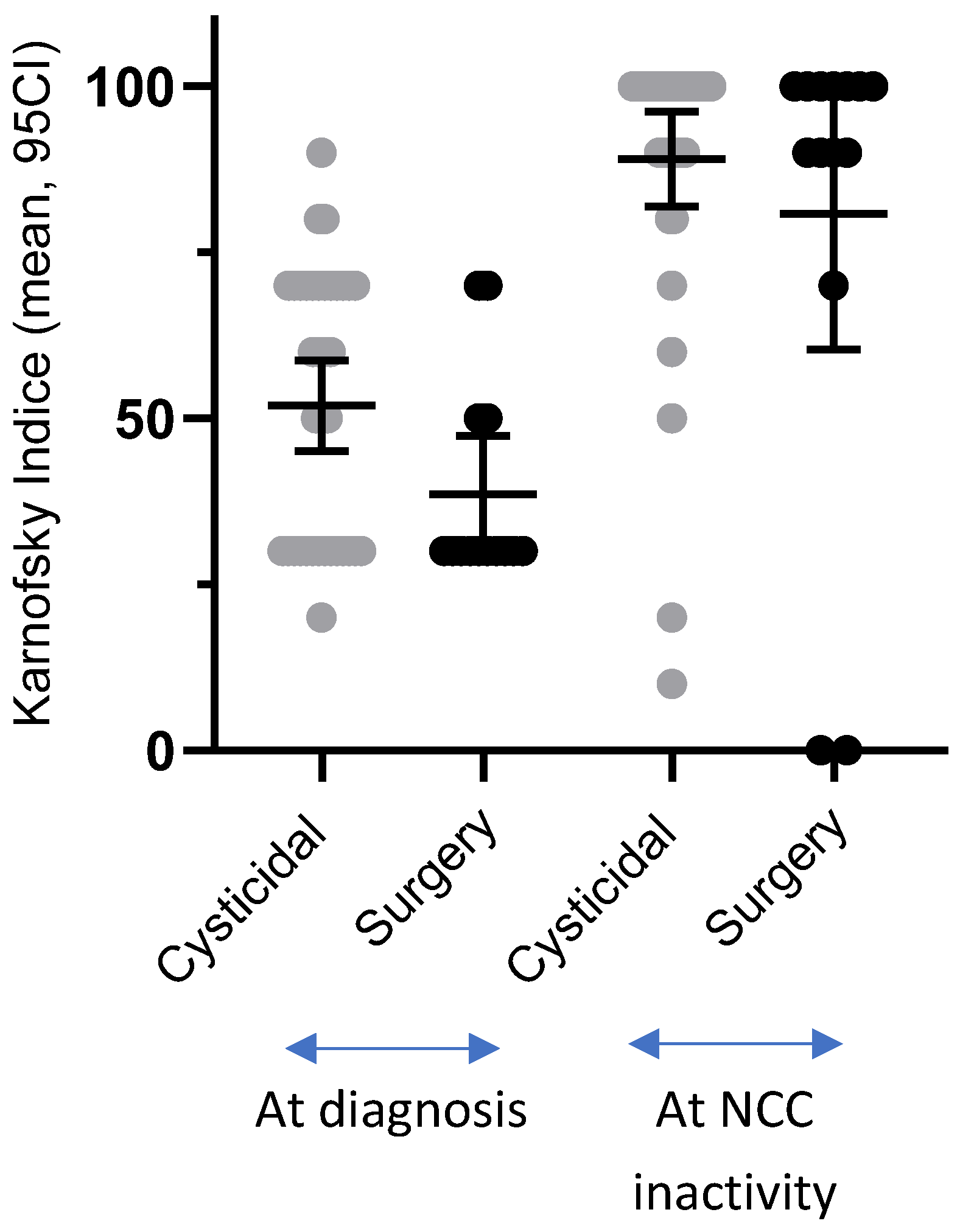 | Karnofsky at inactivity [CI 95%] | 88.92 [81.8–96.1] | 80.71 [60.4–100] | 0.5135 |