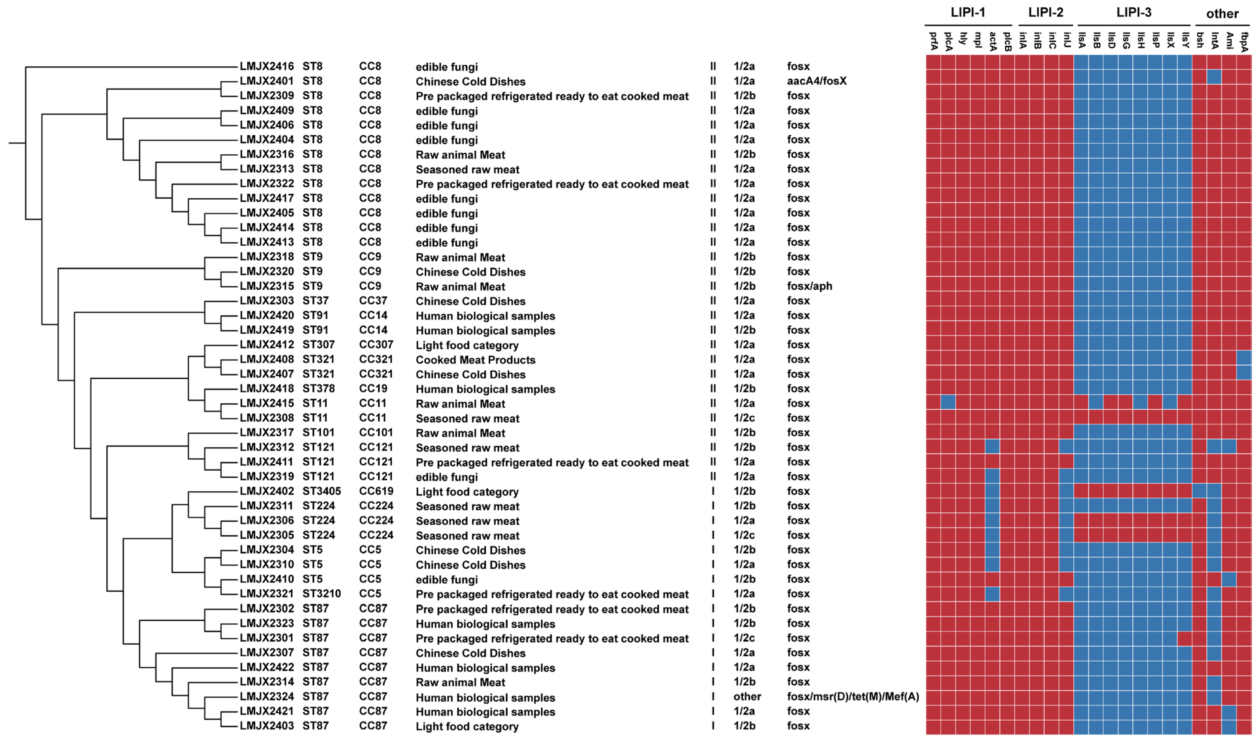 - Zhang, Y.; Liu, Y.Z.; Zhang, P.H.; Wang, D.; Zhang, X.Y. Genomic characteristics and antimicrobial resistance of Listeria monocytogenes isolated from food in Beijing, City 2022. Chin. J. Prev. Med. 2025, 59, 997–1003. [Google Scholar] [CrossRef]