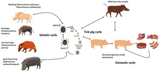 The ASFV icosahedral particle has a multilayered structure with a 170–194 kb long linear dsDNA genome encoding more than 150 open reading frames [11,12,13]. It is the only known DNA virus transmitted by arthropods [14]. In Eastern and Southern Africa, the virus circulates in a sylvatic cycle, which includes wildlife reservoirs as warthogs (Phacochoerus africanus) that are infected by soft ticks of the genus Ornithodoros living in their warrens [15]. The common warthog can remain viremic for long time; however, it does not develop clinical disease because its viremia is usually low [16]. Therefore, ASFV transmission among these animals and domestic pigs is unlikely [17]. Other wild suids could be also involved in this sylvatic cycle, but they are considered to have a less significant role in ASFV dissemination to domestic pigs [14]. In this context, the tick–pig cycle is the most relevant for the ASFV outbreaks in domestic pigs. On the contrary, the contact of domestic pigs with infected wild boars is considered key within the ASFV domestic cycle in the Russian Federation, trans-Caucasian countries and Eurasia [17,18,19,20,21]. Wild boars (Sus scrofa) are native species in Europe, Asia and Northern Africa, and they are susceptible to ASFV infection, showing the same clinical symptoms and mortality rates as domestic pigs (Figure 1). In addition to all these dissemination ways, ASFV spreads over long distances as a result of viral survival in pork products stored even at negative temperatures [22].