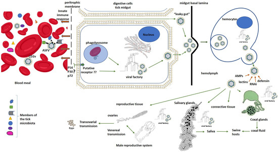 Schematic ASFV “molecular journey” inside ticks. Black arrows represent interactions between ASFV and microorganisms that are part of the tick microbiota inside the gut when infected blood is ingested by ticks. Brown arrows represent effects of the innate immune response mediators of ticks on ASFV. Green arrows represent hypothetical pathways for ASFV entry and dissemination inside ticks. The symbol ? means that the involvement of these viral structural proteins in a specific mechanism for ASFV entry to tick digestive cells remains to be demonstrated. In the same way, ?? means that the putative specific receptor for ASFV entry to tick digestive cells remains to be identified.