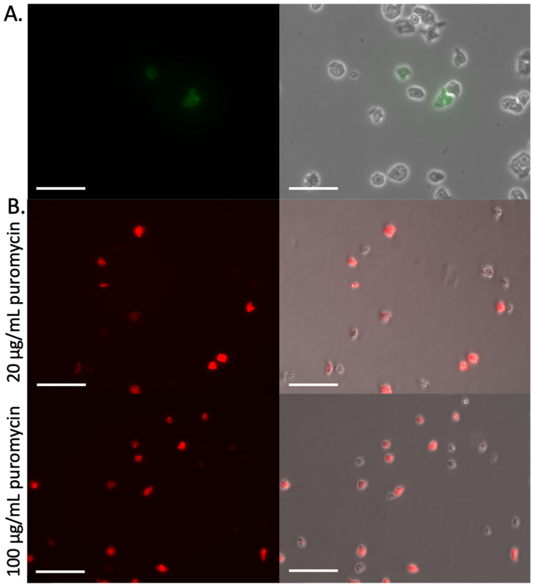 Figure 2A). Application of puromycin (20 µg/mL) at that point eliminated the transfected amoebae. (Please note, we attempted gradually introducing puromycin, initiating treatment at 48 h at 5 µg/mL and then increasing to 20 µg/mL over several days, at which point control and plasmid-transfected cells were all dead). Similar results were observed when we replaced the eYFP gene for mCherry (pPACmCherry.v1), with fluorescence detected in cells prior to application of the selection antibiotic, at which point all cells were killed (See