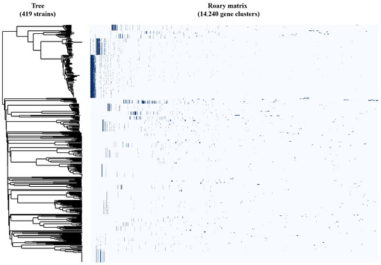 - Page, A.J.; Cummins, C.A.; Hunt, M.; Wong, V.K.; Reuter, S.; Holden, M.T.; Fookes, M.; Falush, D.; Keane, J.A.; Parkhill, J. Roary: Rapid Large-Scale Prokaryote Pan Genome Analysis. Bioinformatics 2015, 31, 3691–3693. [Google Scholar] [CrossRef] [PubMed]