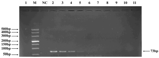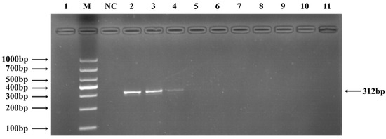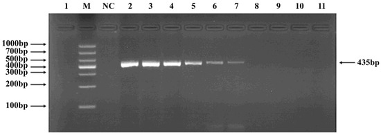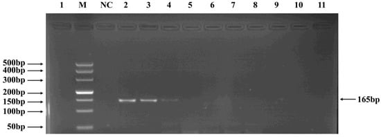 PCR verification results for Tunavirinae phage primers. Note: M, DNA marker; NC, negative control; 1, cross-reaction control; 2–11, template concentrations ranging from 2.96 μg/μL × 10−1~10−10.