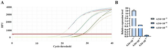 qPCR amplification curves for Tunavirinae primers. (A) Amplification curves for varying concentrations of phage DNA templates; (B) Relative quantification of the templates (normalized to the median concentration group).