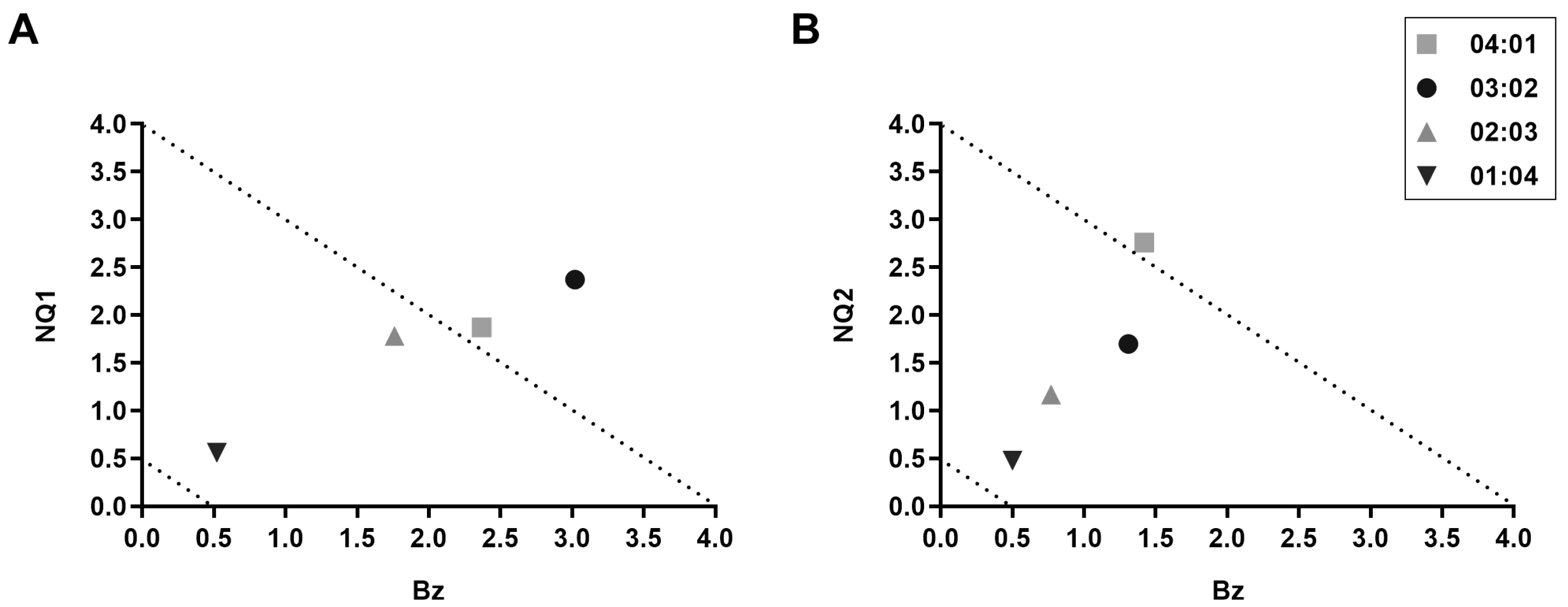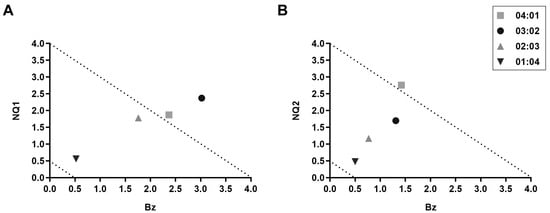 Employing the previously described fixed-ratio method [28], the interaction between Bz and the two naphthoquinones was classified on bloodstream trypomastigotes. The interaction of Bz and NQ1 was additive (no interaction) (∑FIC = 3.56) (Table 2). In the proportions 2:3 and 1:4, the interaction was considered additive, while, in the proportions 4:1 and 3:2, they were classified as antagonistic (Figure 1A). In relation to NQ2, the interaction with Bz was also classified as additive (∑FIC = 2.53). Among the tested proportions, the 1:4 ratio exhibited the lowest ∑FIC (0.98), indicating that it came the closest to a synergistic effect (Table 3). In the proportions 3:2, 2:3, and 1:4, the interaction was additive, and the proportion 4:1 indicated antagonism (Figure 1B).