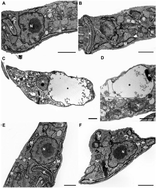 Ultrastructural analysis of T. cruzi epimastigotes treated with 0.8 µM of NQ1 and 1.8 µM of NQ2 in vitro. (A,B) Untreated epimastigotes showing typical morphology of nucleus (N), mitochondrion (M), reservosomes (R), and kinetoplast (K). (C,D) Treatment with NQ1 induced remarkable mitochondrial swelling (black asterisks). (E,F) NQ2-treated parasites presented no ultrastructural damage. F: flagellum; G: Golgi. Bars = 0.5 µm.