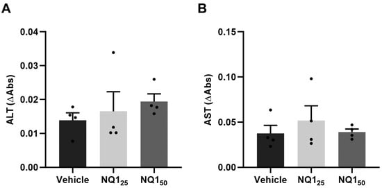 In the next step, NQ1 was synthesized in large amounts to evaluate its trypanocidal activity in vivo. First, the acute toxicity of the compound in non-infected animals was investigated. Treatment with 25 and 50 mg/kg induced no side effects. The analysis of the biochemical markers of hepatic damage (AST and ALT) presented no significant differences in relation to the control group that received only the vehicle (Figure 4). As the highest concentration did not lead to undesirable symptoms, 50 mg/kg was the dose selected for the subsequent assays. Using the acute infection model (Y strain, inoculum 104 trypomastigotes), 50 mg/kg NQ1 was administered by gavage (five doses from 6 to 10 dpi). The naphthoquinone significantly reduced bloodstream parasitemia at 7, 9, and 11 dpi in comparison with the untreated group (Figure 5A). Up to 14 dpi, no mortality or significant variation in body weight was detected in all experimental groups (Figure 5B,C).