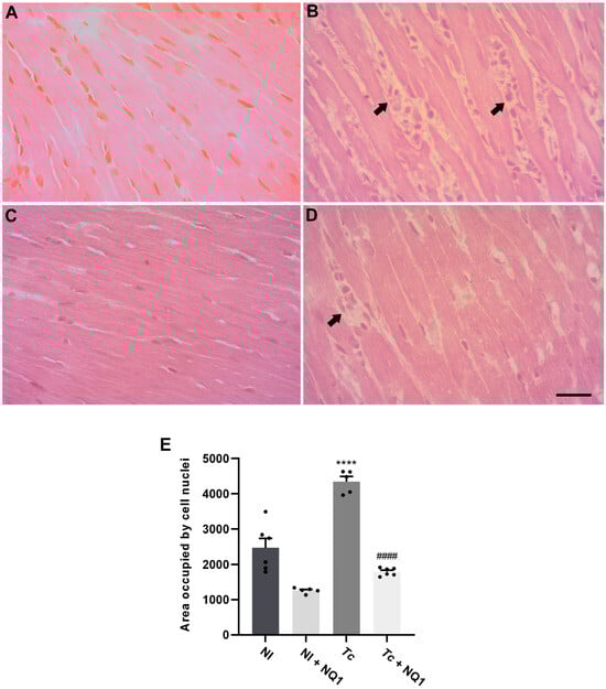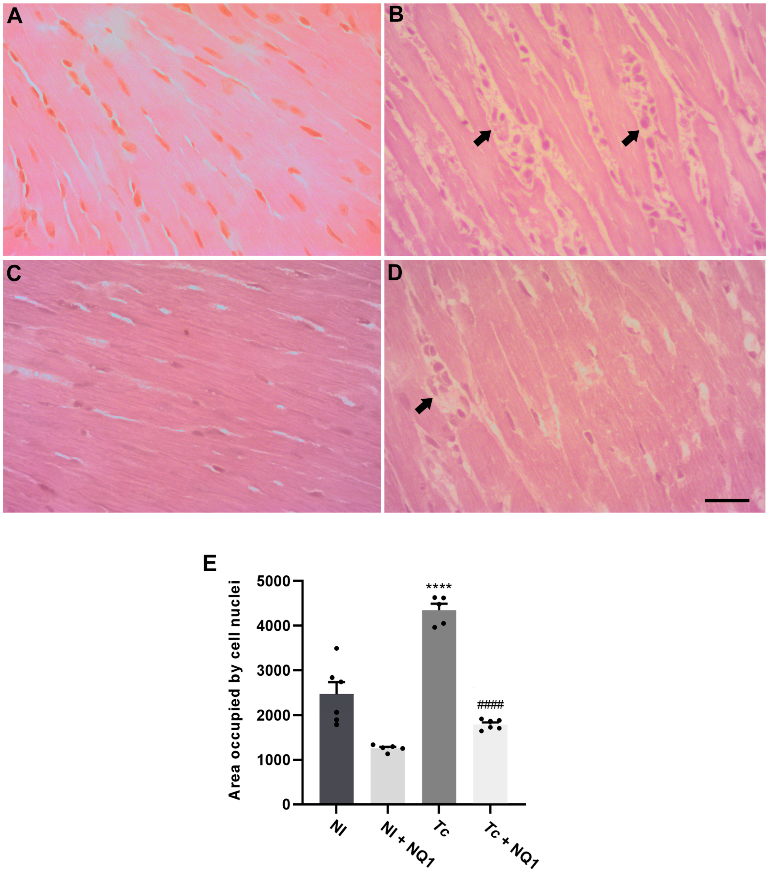 Effects of NQ1 (50 mg/kg) on cardiac inflammation at 14 dpi. (A–D) Representative histological images (hematoxylin and eosin staining). (A) NI; (B) Tc; (C) NI NQ1; (D) Tc + NQ1. Black arrows indicate inflammatory infiltrates. Bar = 100 µm. (E) Quantification of inflammatory infiltrates. Mean ± standard deviation of at least 8 animals per group. Asterisks indicate significant differences between non-infected and infected groups (**** p < 0.0001); hashtags indicate significant differences between untreated and treated groups (#### p < 0.0001). The statistical test employed was one-way ANOVA. NI: non-infected; Tc: T. cruzi; dpi: days post-infection.