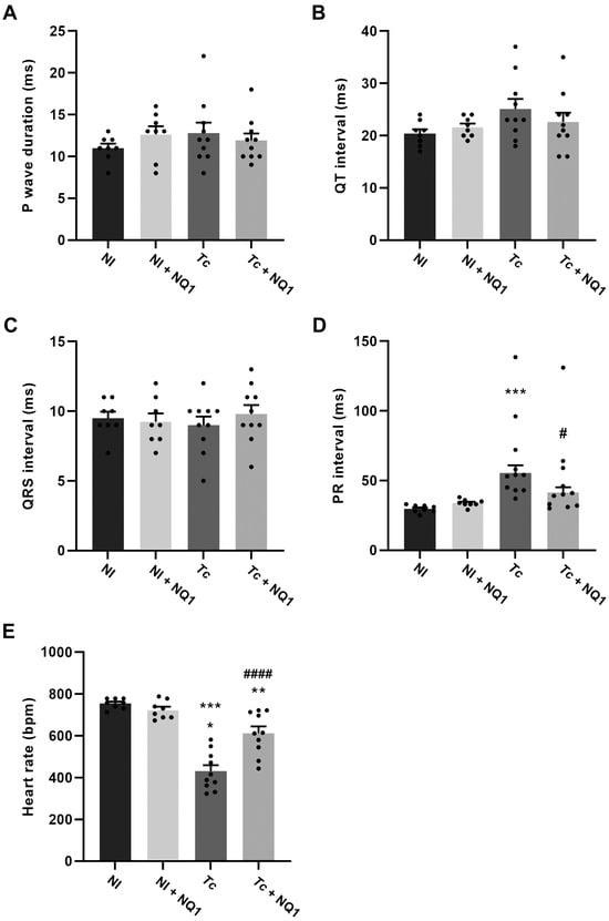 Effect of NQ1 (50 mg/kg) on electrocardiographic profile at 14 dpi. (A) P wave. (B) QT interval. (C) QRS interval. (D) PR interval. (E) Heart rate. Mean ± standard deviation of at least 8 animals per group. Asterisks indicate significant differences between non-infected and infected groups (* p < 0.05; ** p < 0.01; *** p < 0.001). Hashtags indicate significant differences between untreated and treated groups (# p < 0.05; #### p < 0.0001). All data were analyzed by one-way ANOVA test. NI: non-infected; Tc: T. cruzi; dpi: days post-infection.