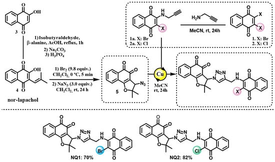 The synthesis of compounds NQ1 and NQ2 began with the preparation of the corresponding amino–alkyne intermediates. For NQ1, the amino–alkyne precursor was obtained from 2,3-dibromonaphthalene-1,4-dione, whereas, for NQ2, it originated from 2,3-dichloronaphthalene-1,4-dione. The nucleophilic substitution of the respective quinones with propargylamine in acetonitrile afforded the quinone–alkyne derivatives (1a and 2a). The azide coupling partner (5) required for the assembly of both target conjugates was synthesized from nor-lapachol via bromide-mediated cycloaddition, followed by nucleophilic substitution with sodium azide. This sequence furnished the desired ortho-quinone (5) in a quantitative yield. In the final step, Cu(I)-catalyzed azide–alkyne cycloaddition (CuAAC) was employed to construct the 1,2,3-triazole framework. Under standard “click” conditions, azide 5 reacted smoothly with the corresponding alkyne derivatives (1a or 2a) to deliver the triazole-bridged quinone conjugates (NQ1 and NQ2) as highly stable products (Scheme 1).