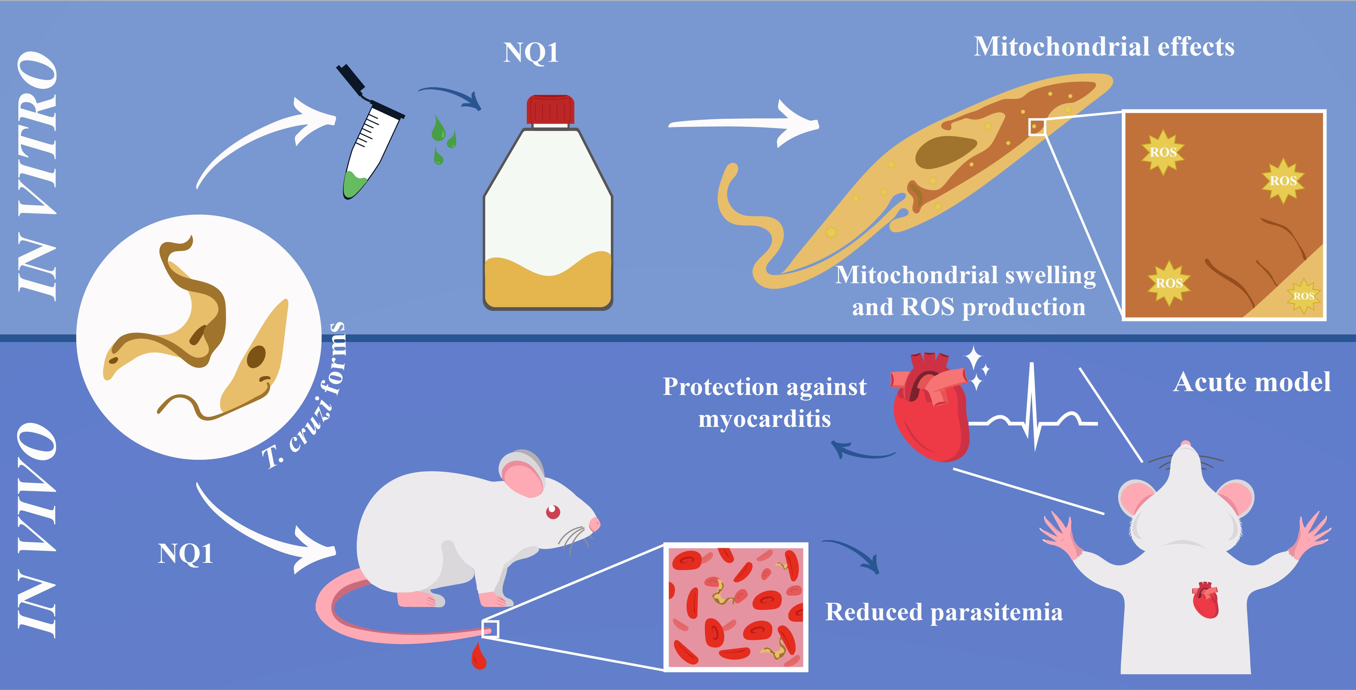 In summary, both quinones presented potent trypanocidal activity (low micromolar range) under all experimental conditions, with low toxicity and higher efficacy than the clinical drug in vitro. The mechanistic analysis pointed to the mitochondrial impairment and ROS production as part of the trypanocidal action of NQ1. This naphthoquinone also showed moderate trypanocidal and promising anti-inflammatory activity in vivo. New tests with alternative formulations, as well as the improvement of therapeutic protocols, could be attractive options for the treatment of affected individuals. Furthermore, additional pharmacological and other experimental evaluations must be performed before clinical trials are conducted.