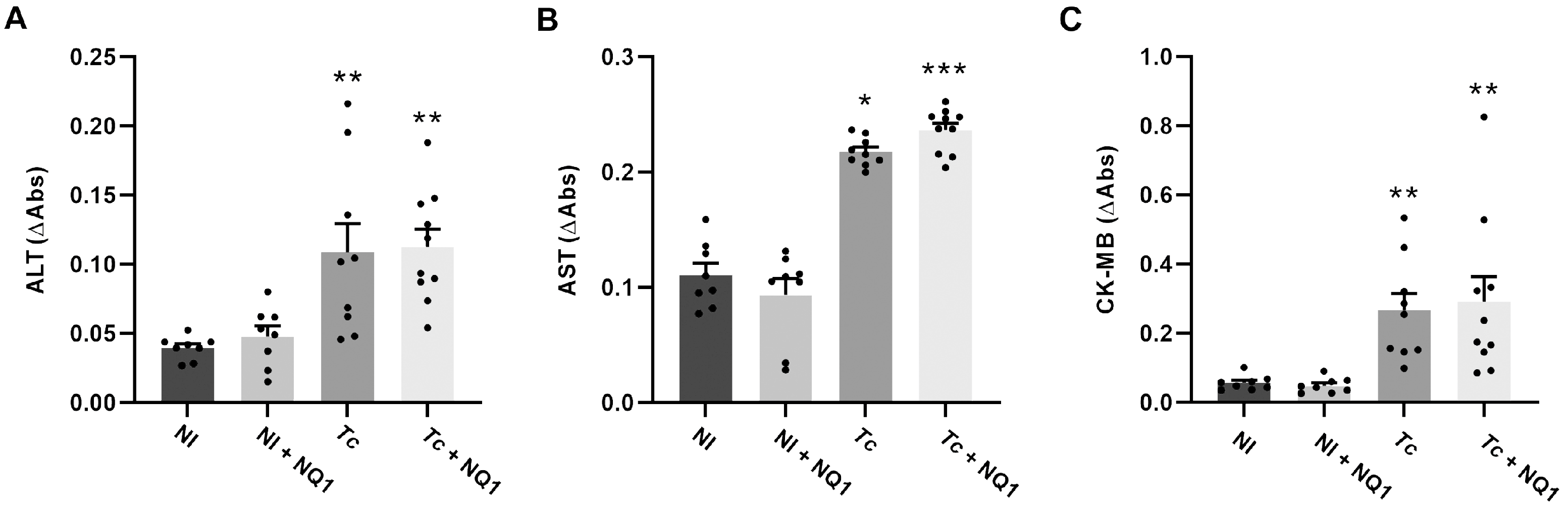 Effects of NQ1 (50 mg/kg) on the plasma levels of biochemical markers at 14 dpi. (A) ALT, (B) AST, (C) CK-MB. Mean ± standard deviation of at least 8 animals per group. Asterisks indicate significant differences between non-infected and infected groups (* p < 0.05; ** p < 0.01; *** p < 0.001) according to one-way ANOVA and Kruskal–Wallis test. ALT: alanine aminotransferase; AST: aspartate aminotransferase; CK-MB: cardiac isoform of creatine kinase; NI: non-infected; Tc: T. cruzi; dpi: days post-infection.