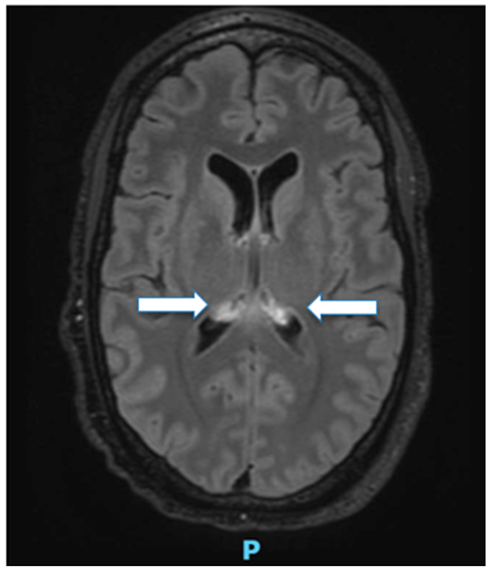 Magnetic resonance imaging (MRI) of the brain revealed bilateral hyperintensities in the corpus callosum and splenium, consistent with cytotoxic lesions of the corpus callosum (CLOCCs) (Figure 2). CLOCCs are typically reversible lesions secondary to metabolic stress or inflammatory processes and are most often seen in the splenium. They have been described in various contexts, including viral infections (e.g., influenza, Epstein–Barr virus, COVID-19), metabolic derangements (hypoglycemia), exposure to chemotherapeutic agents or toxins (e.g., 5-fluorouracil), seizures, antiepileptic drug withdrawal, cerebrospinal fluid disturbances, and rarely bacterial infections [16,17,18,19]. The pathophysiology is thought to involve a cascade of proinflammatory cytokines (IL-1, IL-6, TNF-α) and glutamate-mediated excitotoxicity, leading to cytotoxic edema of myelinated fibers, particularly in regions rich in glutamate receptors such as the splenium. In the context of Salmonella CNS infection, these lesions likely reflect transient inflammatory and metabolic stress rather than direct bacterial invasion [16].
