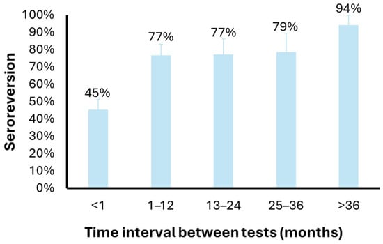 A subset of seropositive subjects (N = 160) repeated the test after some time during the study period. Overall, 106 (66%) subjects who tested seropositive at the first ELISA test had a negative result at the second ELISA test. By stratifying the proportion of subjects with discordant test results by the time interval between the two tests, it is possible to observe an increase with time, from 45% for tests performed within a month (n = 64) to 77% for tests performed within 1 (n = 43) or 2 (n = 22) years, to 79% for tests performed within 3 years (n = 14) and 94% for tests performed after 3 years (n = 17) (Figure 1).