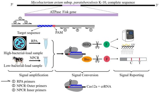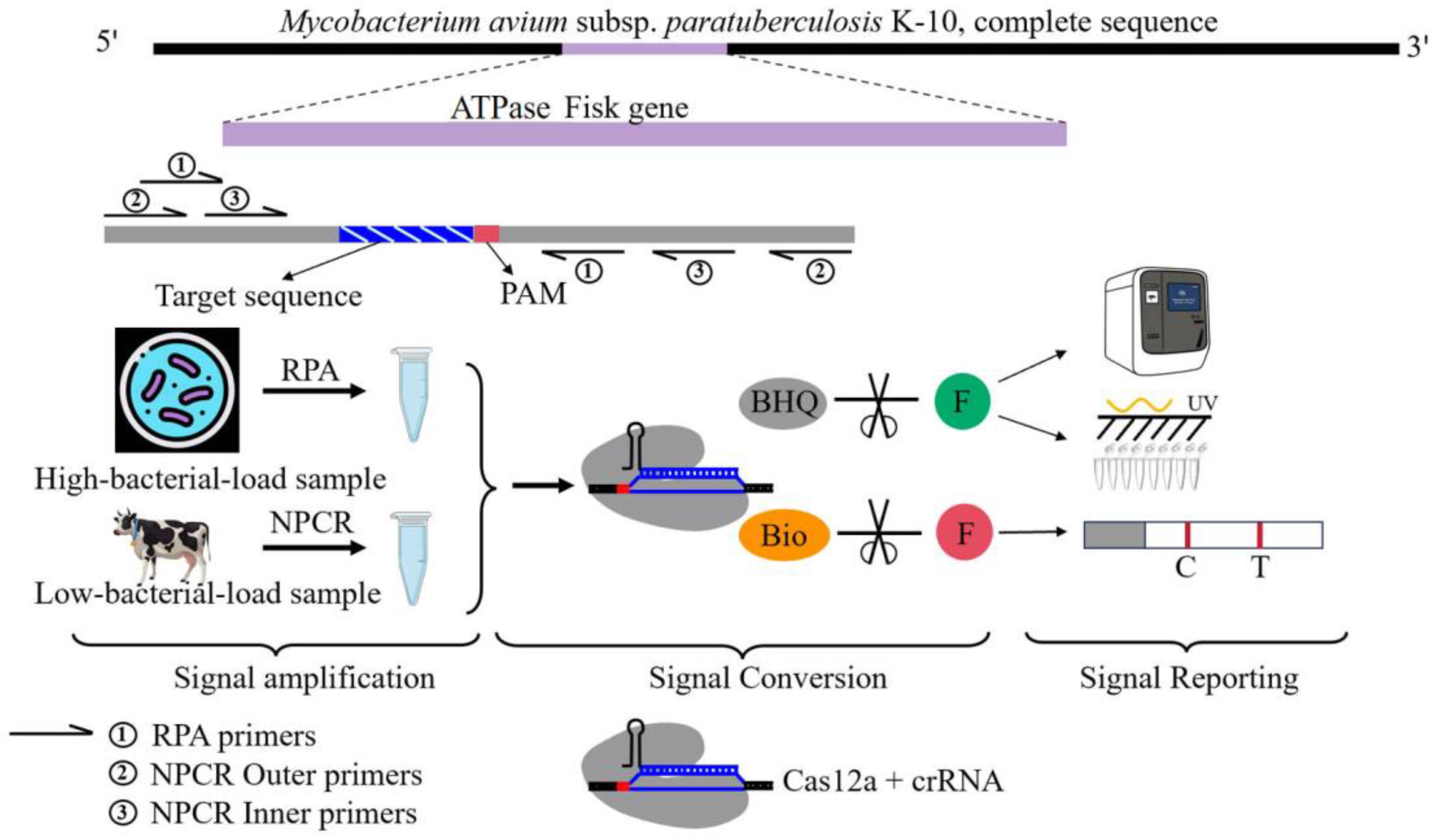 In recent years, isothermal amplification has been integrated with CRISPR-Cas12a to develop the DNA endonuclease-targeted CRISPR trans reporter system, i.e., DETECTR, for rapid, highly sensitive pathogen detection [19]. A more convenient one-step assay linking RPA and CRISPR-Cas12a has also been developed [20], where Cas12a is encapsulated in a gel matrix for integrated single-step detection [21]. Results can be visualized through lateral flow assays, but the assay’s performance depends heavily on RPA efficiency [22]. This study aims to establish a flexible, convenient, and efficient MAP detection system by integrating RPA or nested PCR with CRISPR-Cas12a to achieve two-step target DNA signal amplification, followed by visualization with lateral flow assay, allowing detection across varied sample types and conditions (Figure 1).