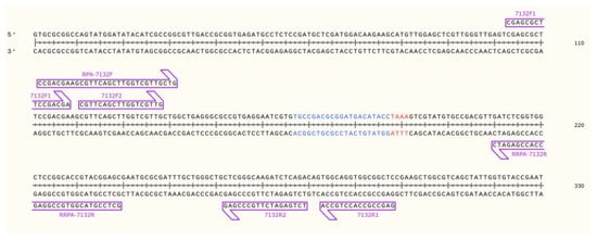 RPA method was used for DNA extracted from samples with high bacterial loads, such as bacterial colonies, to enrich target dsDNA under isothermal conditions. The TwistAmp® (TwistDx, Hertfordshire, UK) Basic Kit was used according to the manufacturer’s instructions. The 50 μL reaction volume contained 29.5 μL of rehydration buffer, 2.4 μL of 10 μM of each primer (RPA-7132F/RPA-7132R), 1 μL of extracted DNA, 2.5 μL of 280 nM magnesium acetate (MgOAc), and sterile nuclease-free water up to 50 μL. The reaction was run at 37–42 °C (six temperature points at 1 °C intervals) for 20 min. MgOAc was added to the inner tube lid, whereas the other reagents were placed at the bottom of the tube before capping. A brief spin was used to mix MgOAc with the solution, initiating the RPA reaction.
