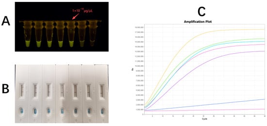 Figure 3. Determination of the limit of detection. (A) Fluorescence observation method, (B) test strip detection method, and (C) instrument-based detection method.