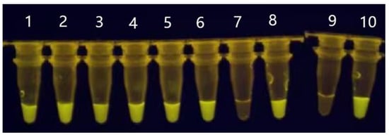 Figure 5. Detection results from colony sample analysis. Tubes 1–6 and 8: DNA from bacterial colonies; tube 7: DNA from MAP-positive fecal sample; tube 9: negative control; tube 10: positive control.