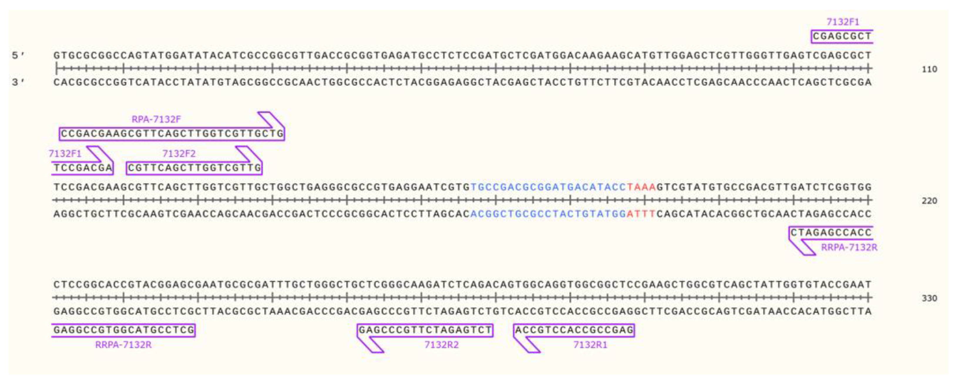 ATPase FtsK gene [23] was selected as the target sequence for crRNA design. A 20-nucleotide sequence located downstream of a T-rich protospacer adjacent motif (PAM) was chosen as the target site, and a corresponding hairpin structure was designed according to the specific Cas12a enzyme used. Primers for RPA and nested PCR were designed based on the target region using Primer Premier 6. Three primer pairs were designated as follows: RPA-7132F (CCG ACG AAG CGT TCA GCT TGG TCG TTG CTG)/RPA-7132R (GCT CCG TAC GGT GCC GGA GCC ACC GAG ATC); 7132F1 (CGA GCG CTT CCG ACG A)/7132R1 (GAG CCG CCA CCT GCC A); and 7132F2 (CGT TCA GCT TGG TCG TTG)/7132R2 (TCT GAG ATC TTG CCC GAG) (Figure 2). To verify in silico that the two chosen genomic regions were unique to MAP, the target sequences were analyzed using the Basic Local Alignment Search Tool (BLAST) program (https://blast.ncbi.nlm.nih.gov/Blast.cgi, accessed on 12 July 2025) and aligned against the GenBank (http://www.ncbi.nlm.nih.gov, accessed on 12 July 2025) nucleotide database to confirm specificity.