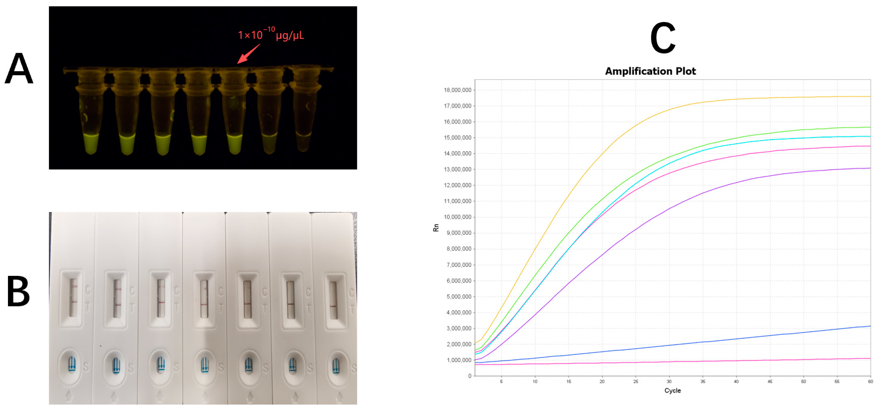 RPA–CRISPR-Cas12a platform had a sensitivity of ≤10−10 μg/μL for the target gene, whereas the nested PCR–CRISPR-Cas12a platform achieved a higher sensitivity of ≤10−14 μg/μL. The three signal readout methods (Figure 3) showed differences in sensitivity, and compared with the lateral flow test strip method, instrumental detection and fluorescence observation were each one order of magnitude more sensitive. When DNA concentration in the CRISPR-Cas12a reaction system was ≥1 × 10−4 μg/μL, the ssDNA reporter probe was efficiently cleaved, producing a detectable fluorescence signal.
