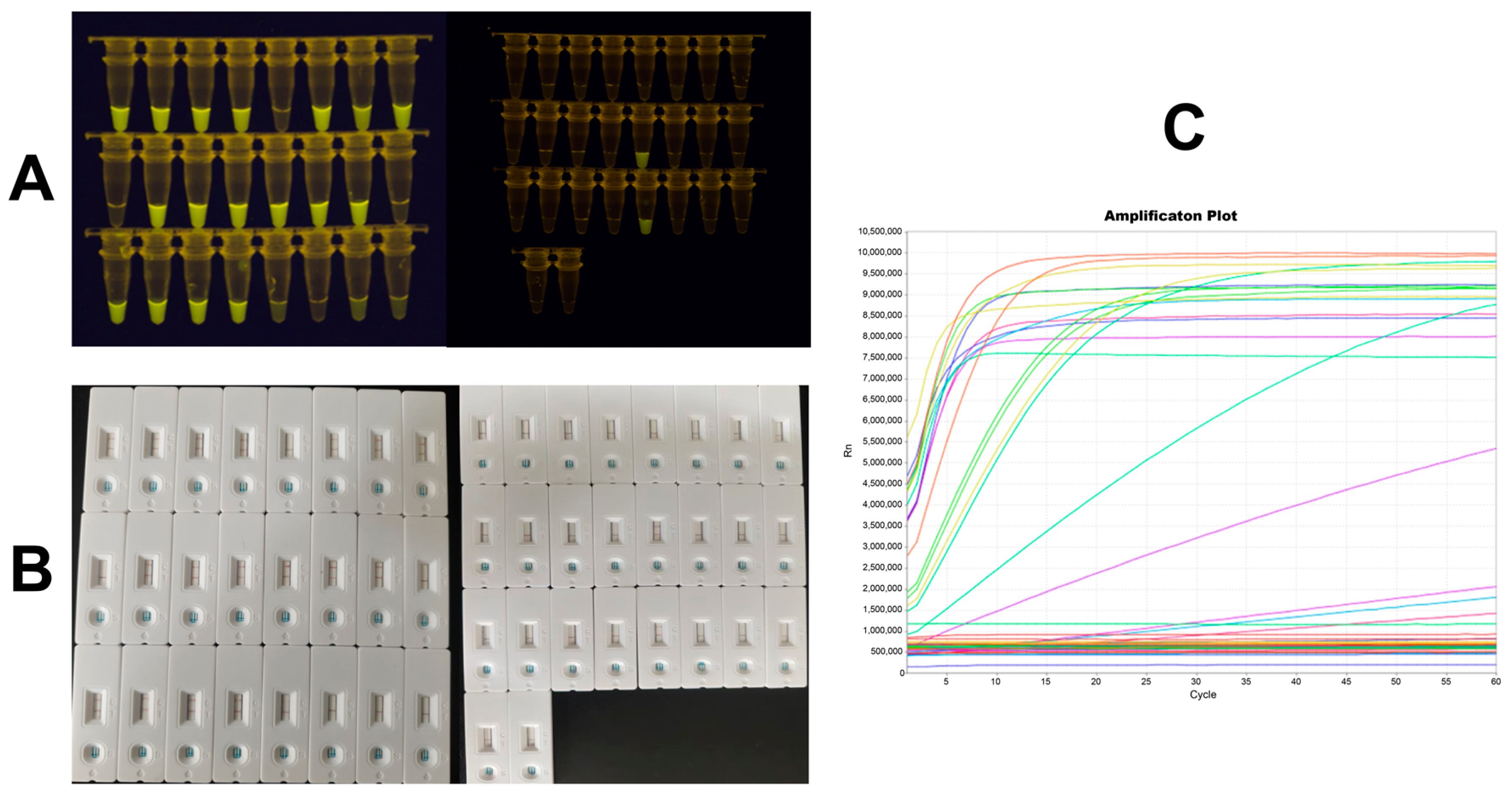 Figure 4. Detection results from fecal sample analysis. (A) Fluorescence observation method, (B) test strip detection method, and (C) instrument-based detection method.