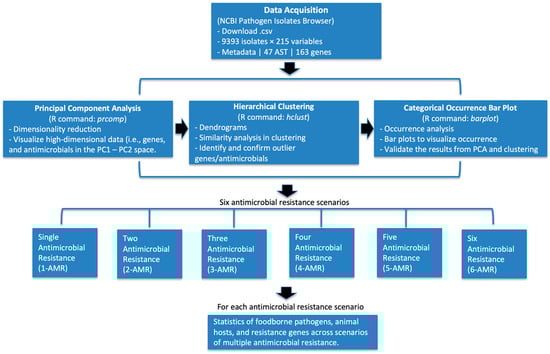 The outline of the data analysis methods used in this study is shown in Figure 1. Data were downloaded from the NCBI Pathogen Detection Isolates Browser in .csv format, filtered for U.S. isolates from 2015 to 2025 with complete metadata on organisms, hosts, geographic origins, and antimicrobial susceptibility testing (AST). The datasets were processed into matrices, and resistance genes with very low appearances or variance were removed to reduce noise. In particular, a 1% frequency threshold was applied to focus the analysis on resistance genes that are more commonly observed across isolates and therefore most relevant for identifying major antimicrobial resistance patterns and clinically meaningful co-resistance trends. Principal component analysis (PCA) and hierarchical clustering were then applied to the resistance profiles, enabling the selection of six priority antimicrobials (ampicillin, ciprofloxacin, nalidixic acid, sulfisoxazole, streptomycin, and tetracycline), with bar plot validation of their occurrence. Pathogen isolates were further categorized by the number of antimicrobials showing resistance, producing subsets Data_AMR_1 through Data_AMR_6 (e.g., Data_AMR_6 contains isolates resistant to six antimicrobials). For each multiple antimicrobial resistance (M-AMR) scenario, AMR distributions were examined across pathogens, while associated genes were identified (bar plots). Finally, results were compared across M-AMR scenarios (e.g., from Data_AMR_1 to Data_AMR_6) to identify co-resistance patterns and multi-antimicrobial resistance trends. Because PCA and hierarchical clustering are exploratory, unsupervised methods rather than hypothesis-testing procedures, no statistical significance levels (α) were applied in this study.