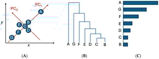 The schematic of the multivariate workflow used in this study. (A) PCA projection of Genes A–G for visualization; (B) hierarchical clustering of PCA coordinates using Euclidean distance and Ward’s linkage, with the elbow method used to determine cluster boundaries; (C) occurrence bar plotting to validate and prioritize genes based on their observed frequencies across isolates.