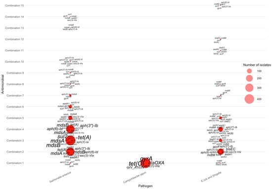 For isolates resistant to five antimicrobials, the six combinations listed in Table 6 produced distinct pathogen–gene patterns, as shown in the corresponding bubble plot. Most AMR-5 isolates belonged to Salmonella enterica, with Combination 1 (tetracycline–streptomycin–sulfisoxazole–nalidixic acid–ciprofloxacin; 153 isolates) contributing the largest cluster. Within this group, several multidrug-efflux and aminoglycoside-modifying genes—including mdsA, mdsB, gyrA, tet(A), floR, aadA1, and aph(3″)-Ia,—were highly enriched (as shown in Figure 8), reflecting broad-spectrum resistance mechanisms. Combination 2 (tetracycline–sulfisoxazole–ampicillin–nalidixic acid–ciprofloxacin; 76 isolates) showed a similar genetic profile, again dominated by mdsA, mdsB, aac(3)-IVa, tet(A), and aadA1, with slightly fewer total occurrences. Combination 3 (tetracycline–streptomycin–sulfisoxazole–ampicillin–nalidixic acid; 30 isolates) displayed a reduced but consistent pattern, primarily featuring mdsA, mdsB, tet(A), and aph(3″)-Ib.
