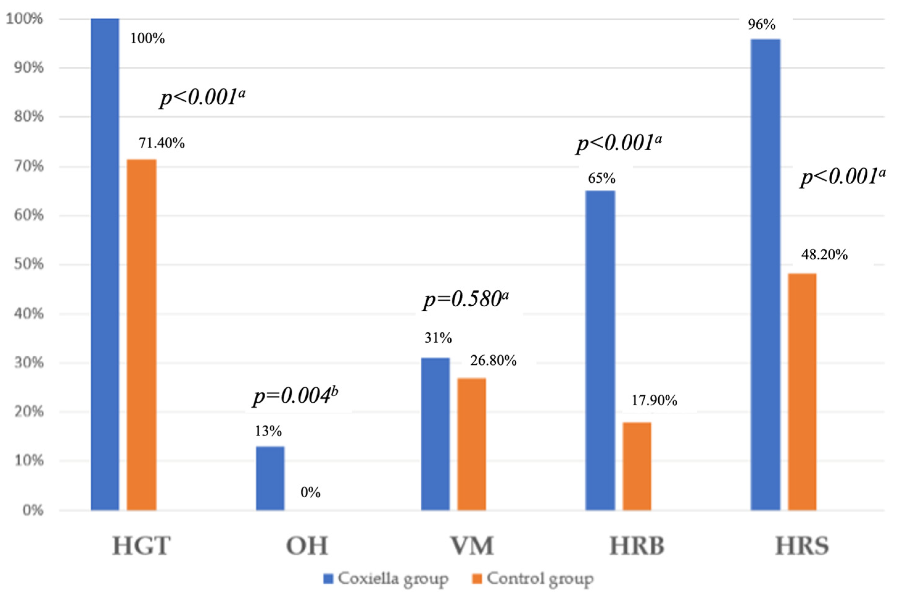 The demographic characteristics of the study population are presented in Table 1. As noted, there were no statistically significant differences between the Coxiella and control groups with respect to age or sex distribution. The majority of participants in both groups were female, with a mean age above 40 years. Within the Coxiella group, the most frequently observed clinical condition was ME/CFS, followed by a history of previous syncope. Other chronic comorbidities were present in fewer than 5% of participants.