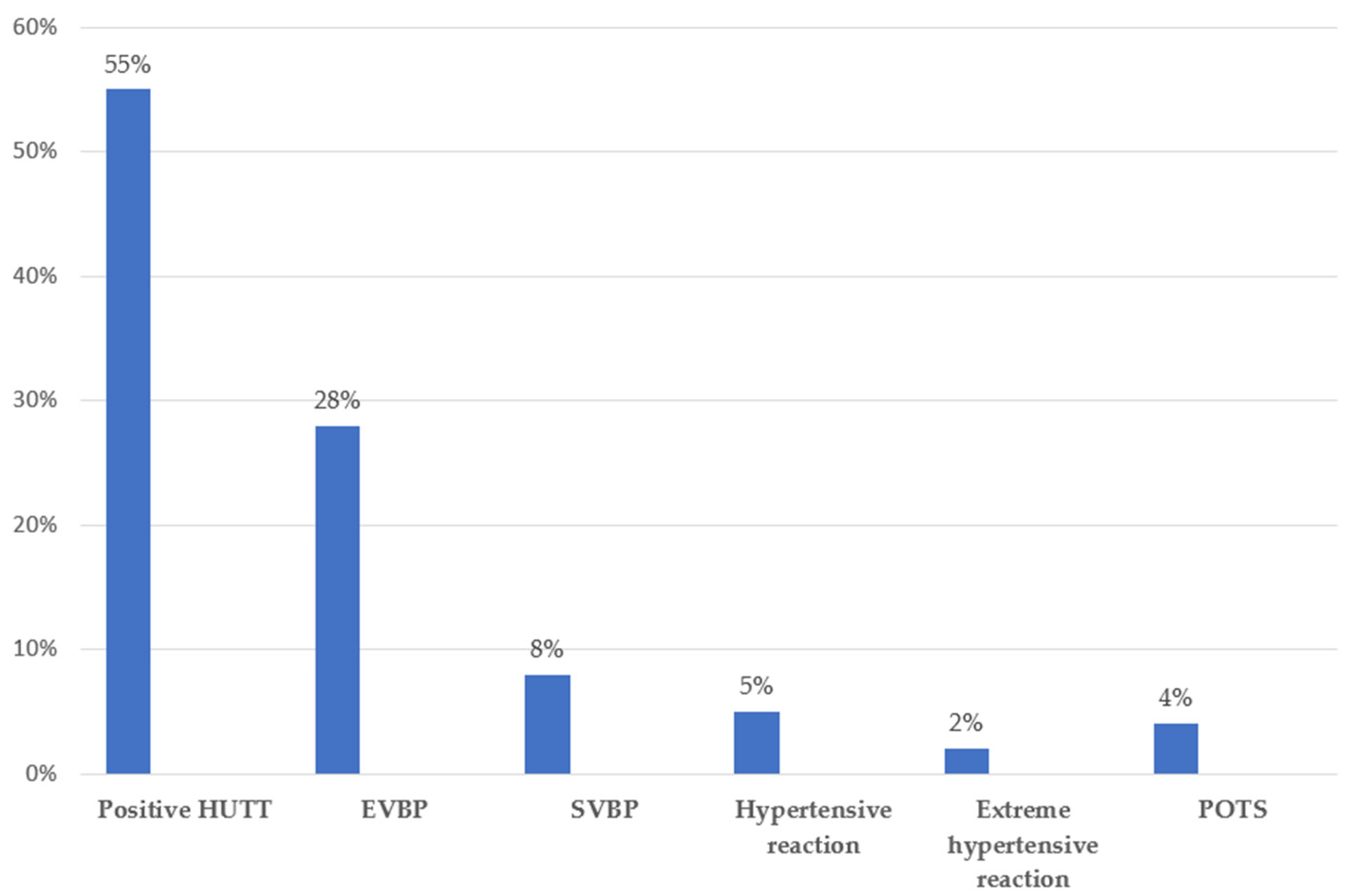 As shown in Figure 2, 55% of patients had a positive HUTT, which aligns with the high prevalence of prior syncope in this group (Table 1). The most common abnormality was extreme blood pressure variability, a pattern also reported in ME/CFS and PCS, where it appears in ~45% of patients with previous syncope [45]. Such fluctuations likely reflect impaired short-term baroreceptor regulation and are strong predictors of vasovagal responses during HUTT [51]. Only 4% of patients exhibited POTS, consistent with its higher prevalence in PCS and infections such as Mycoplasma or Borrelia, but not Coxiella [13,18,52]. Overall, these HUTT findings indicate underlying dysautonomia and may contribute to orthostatic intolerance, although further studies are needed to clarify the mechanisms.