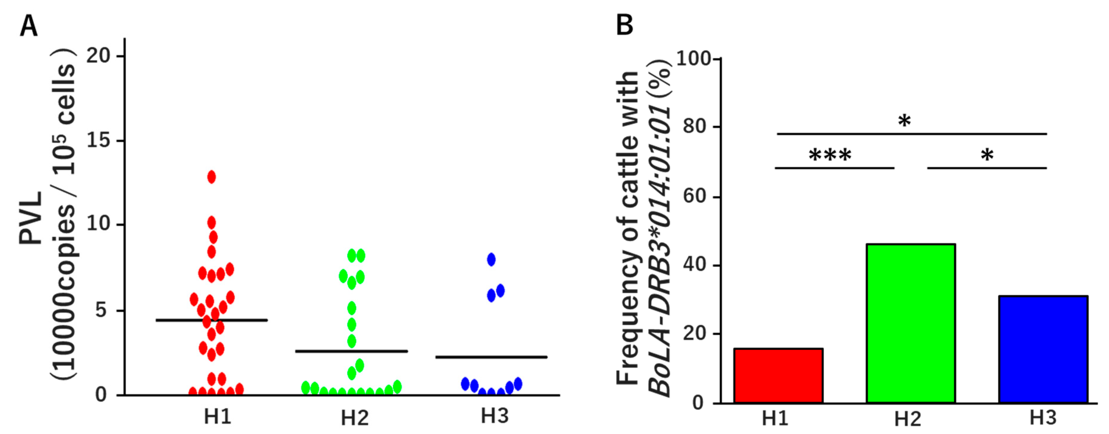 - Takeshima, S.N.; Ohno, A.; Aida, Y. Bovine leukemia virus proviral load is more strongly associated with bovine major histocompatibility complex class II DRB3 polymorphism than with DQA1 polymorphism in Holstein cow in Japan. Retrovirology 2019, 16, 14. [Google Scholar] [CrossRef]