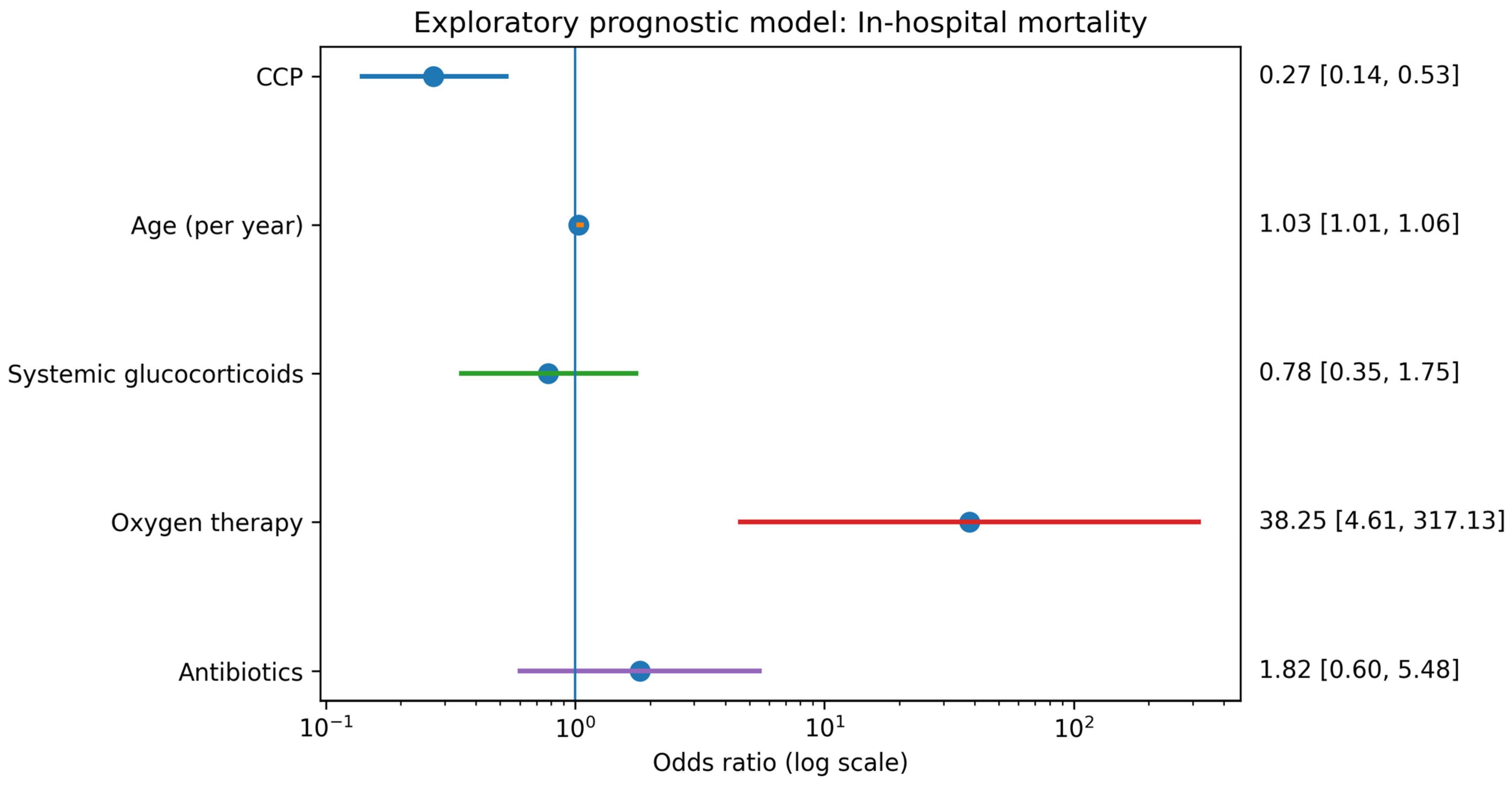 In the exploratory prognostic model additionally including oxygen therapy and antibiotic treatment during hospitalization as markers of disease severity and intensity of care, CCP remained independently associated with lower odds of in-hospital death (OR 0.27; 95% CI 0.14–0.53;