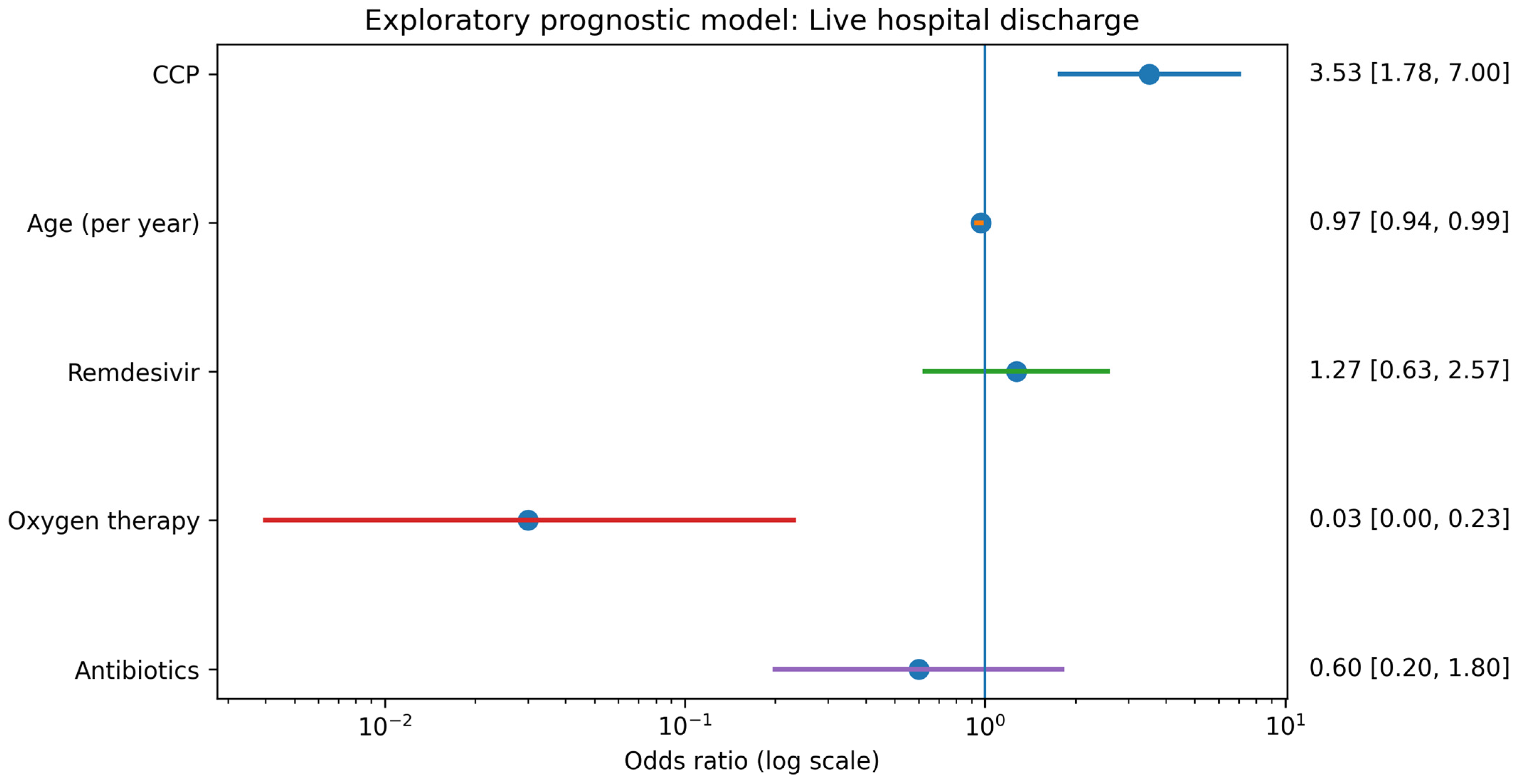 In the exploratory prognostic model additionally including oxygen therapy and antibiotic treatment during hospitalization as markers of disease severity and intensity of care, CCP remained strongly associated with higher odds of live discharge (OR 3.53; 95% CI 1.78–7.00;