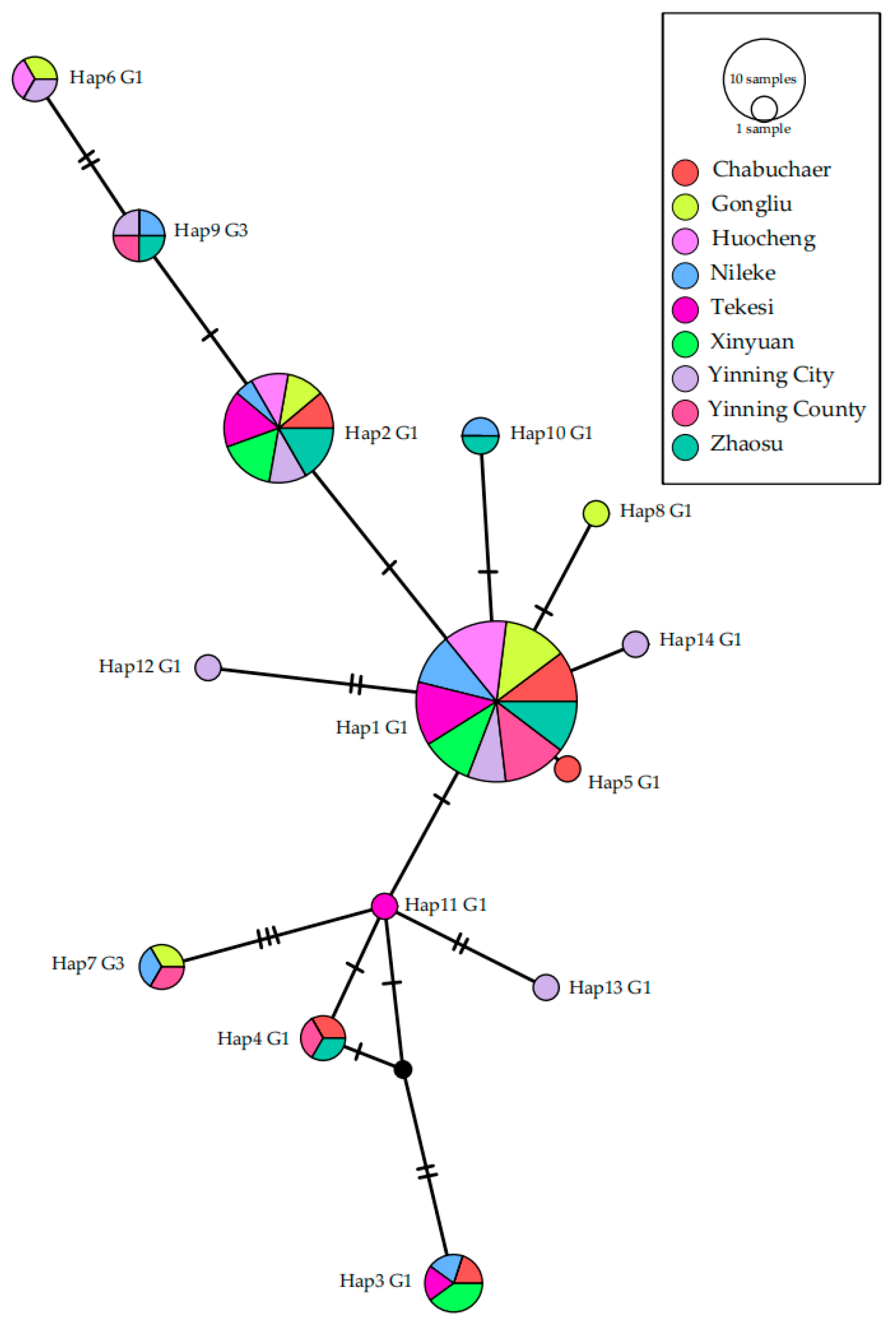 44] documented 10 Haps in Yili Prefecture and 9 Haps in Changji Hui Autonomous Prefecture of Xinjiang. The discrepancies in reported haplotype diversity across studies are likely multifactorial. Key influencing variables include the sample size (with larger, more comprehensive surveys like ours capturing greater diversity), the geographical scale and sampling strategy (targeting a single prefecture vs. multiple pooled regions), the choice of genetic marker (