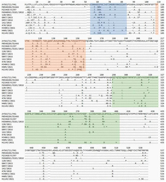 Figure 1. Comparison of the amino acid structure of the S1 protein of the tested and reference strains. Amino acid numbering was based on the spike-codon S1 region of IBV M41 strain. Dots show identity with reference strain sequence. The previously identified hypervariable regions of IBV-M41 of S1 [21] are highlighted in blue (HVR1), orange (HVR2), and green (HVR3).