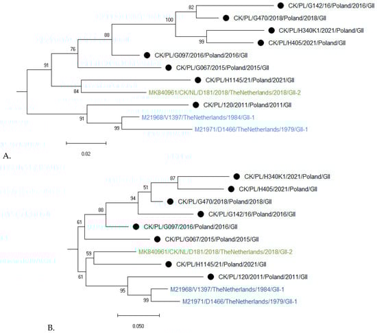 Figure 3. Maximum likelihood phylogenetic analysis of GII IBV strains of the S1 nucleotide (A) and amino acid (B) sequences. Trees were constructed using adaptive bootstrap iterations and GTR + G + I and WAG + I + F models for nt and aa sequences, respectively. The taxon name of the Polish strains characterized in the presented study is marked with a black dot. Names of reference strains are in blue or green colors.