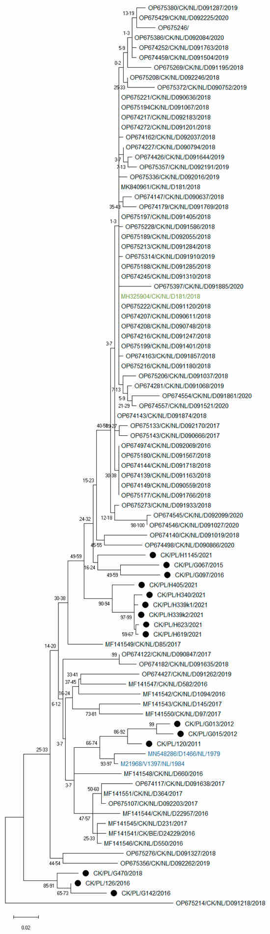 Figure 4. Maximum likelihood phylogenetic inference of GII IBV strains based on nucleotide sequences of the HVR3 region of the S1 gene. The tree was constructed using 1000 bootstrap iterations and the TIM3 + F + I + G4 model. The taxon name of the Polish strains is marked with a black dot. Names of reference strains are in blue or green colors.