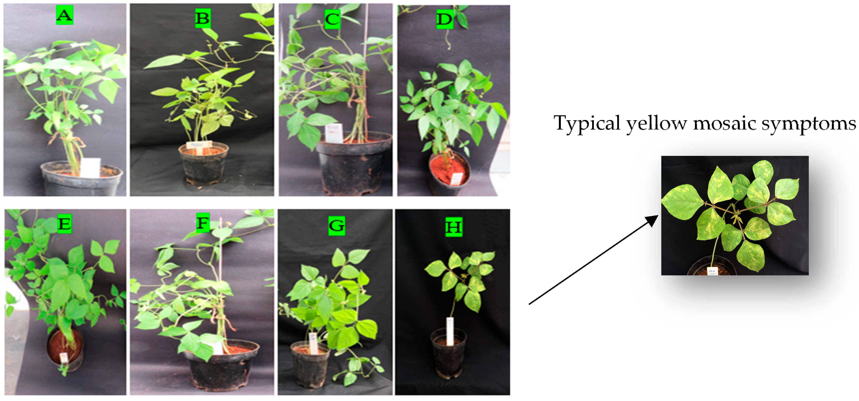 - Sudha, M.; Karthikeyan, A.; Nagarajan, P.; Raveendran, M.; Senthil, N.; Pandiyan, M.; Angappan, K.; Ramalingam, J.; Bharathi, M.; Rabindran, R.; et al. Screening of mungbean (Vigna radiata) germplasm for resistance to Mungbean yellow mosaic virus using agroinoculation. Can. J. Plant Pathol. 2013, 35, 424–430. [Google Scholar] [CrossRef]