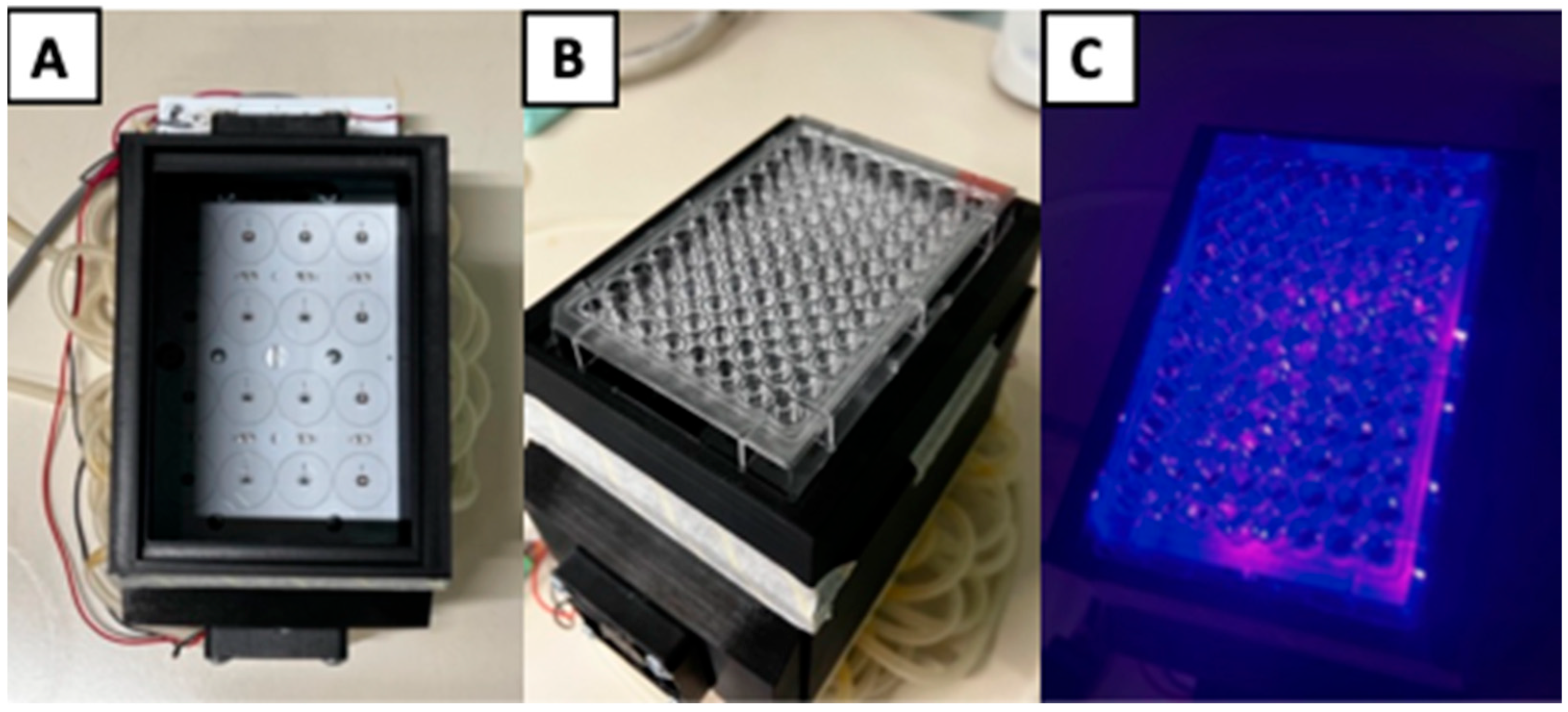 Figure 2). It was designed with CAD software Solidworks 2020 Professional (Dassault Systèmes, Waltham, MA, USA) and fabricated with a 3D printer (Ultimaker B.V., Utrecht, The Netherlands). Characterization of the electromagnetic spectrum was performed with the use of an Avantes ULS2048CL-EVO spectrophotometer (Avantes, Apeldoorn, The Netherlands). The LEDs provide unpolarized radiation with a peak wavelength of 405 nm and a narrow spectral bandwidth (Full Width at Half Maximum, FWHM) of 10 nm. The irradiance was maintained at a constant 21 mW/cm