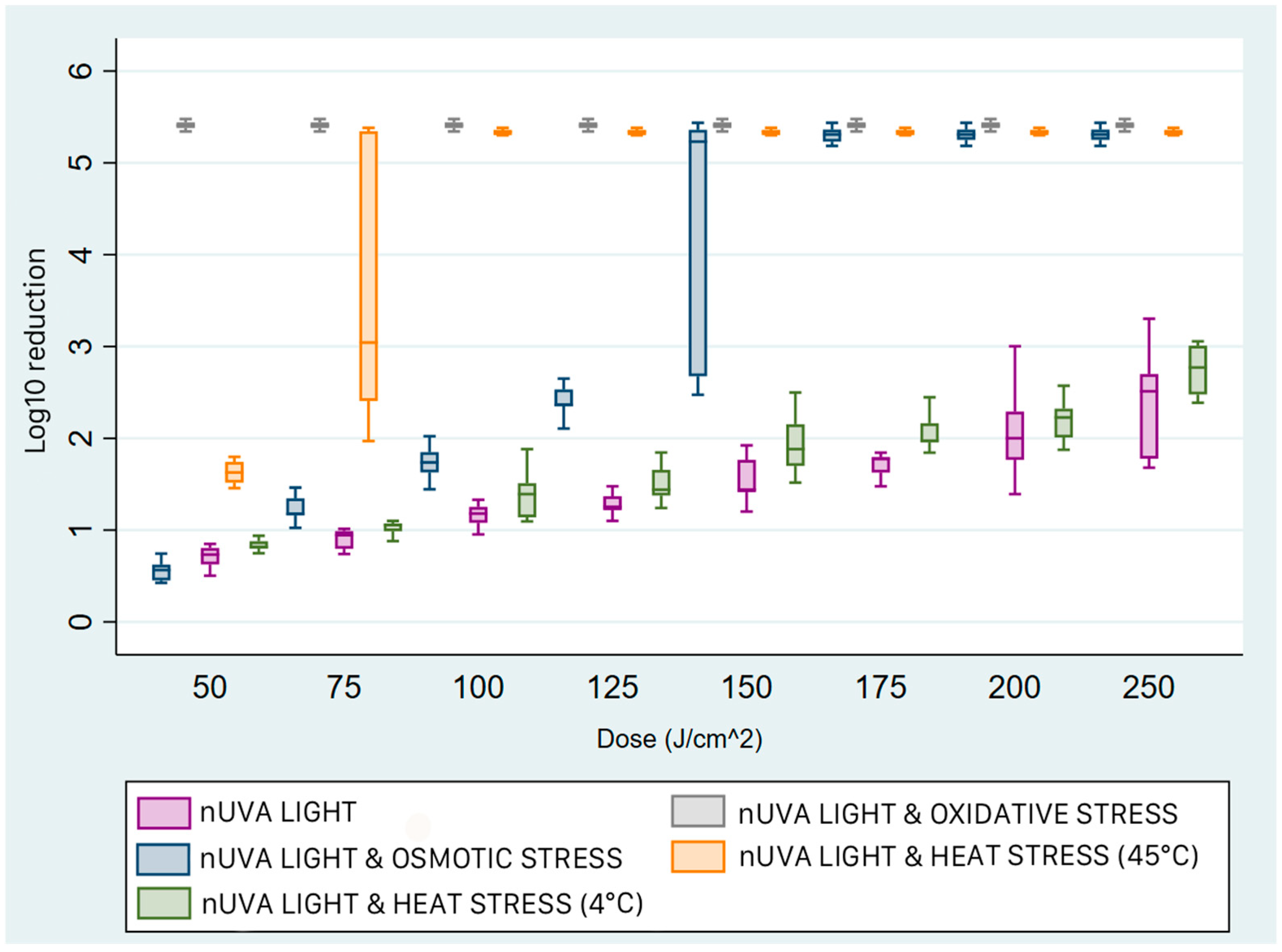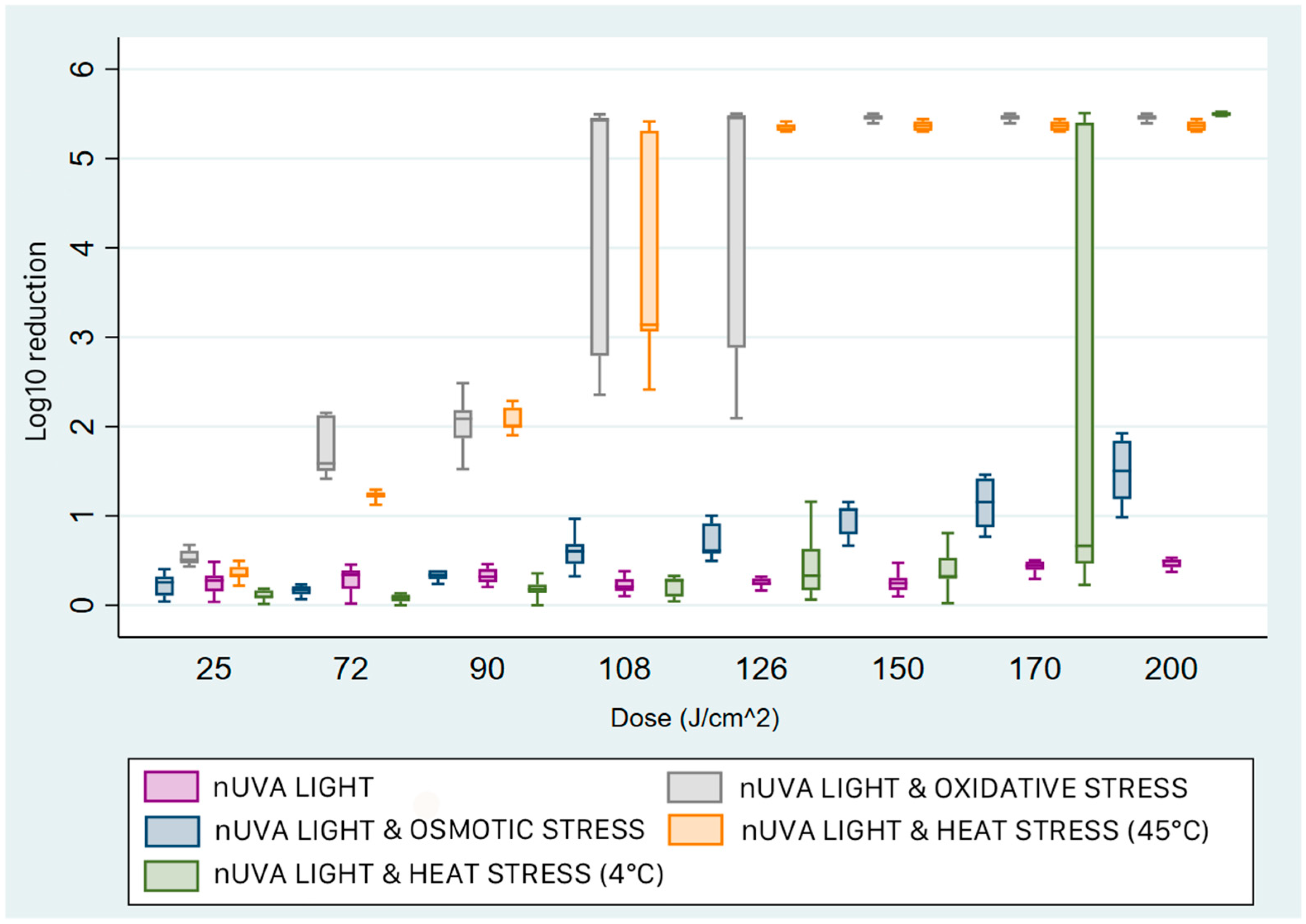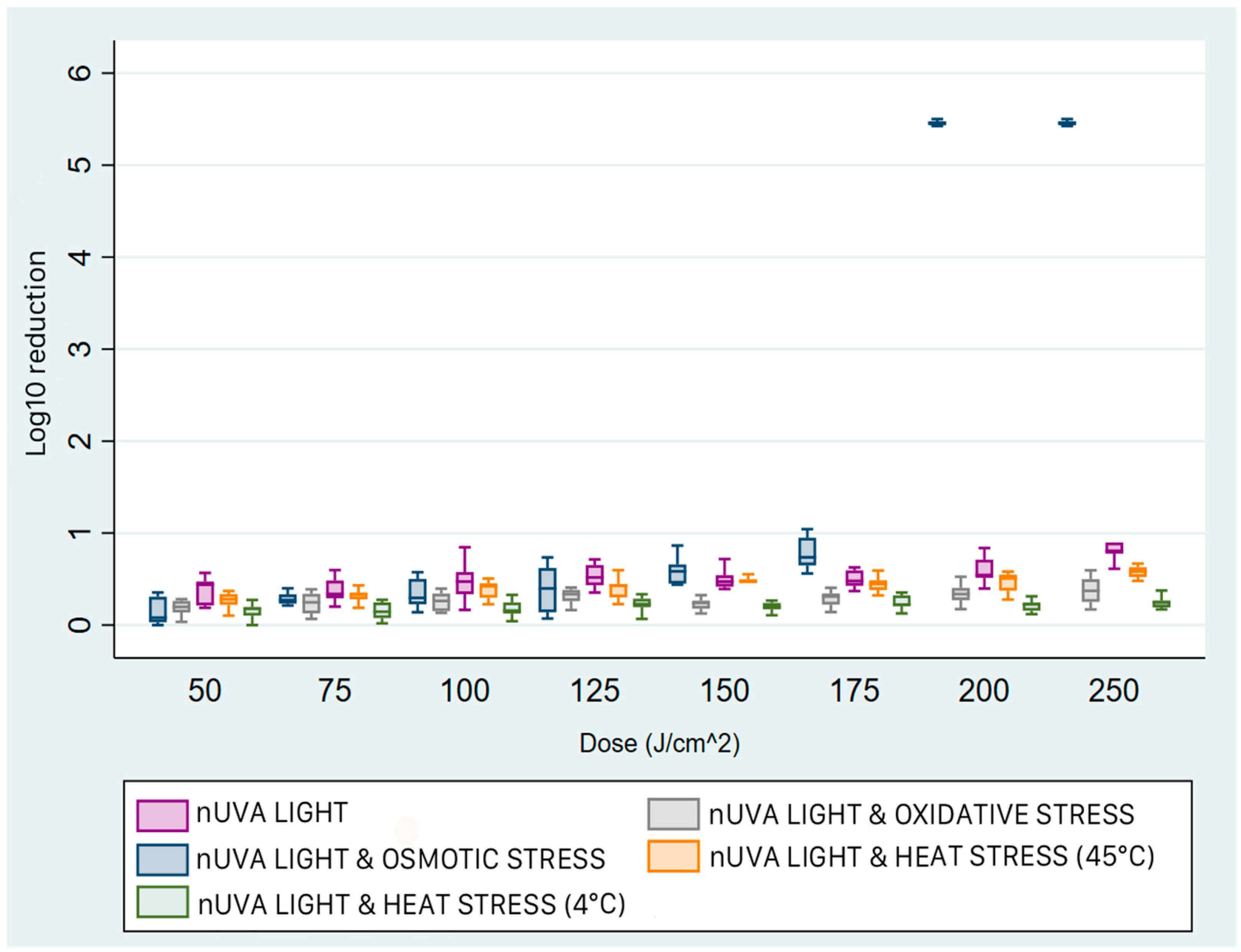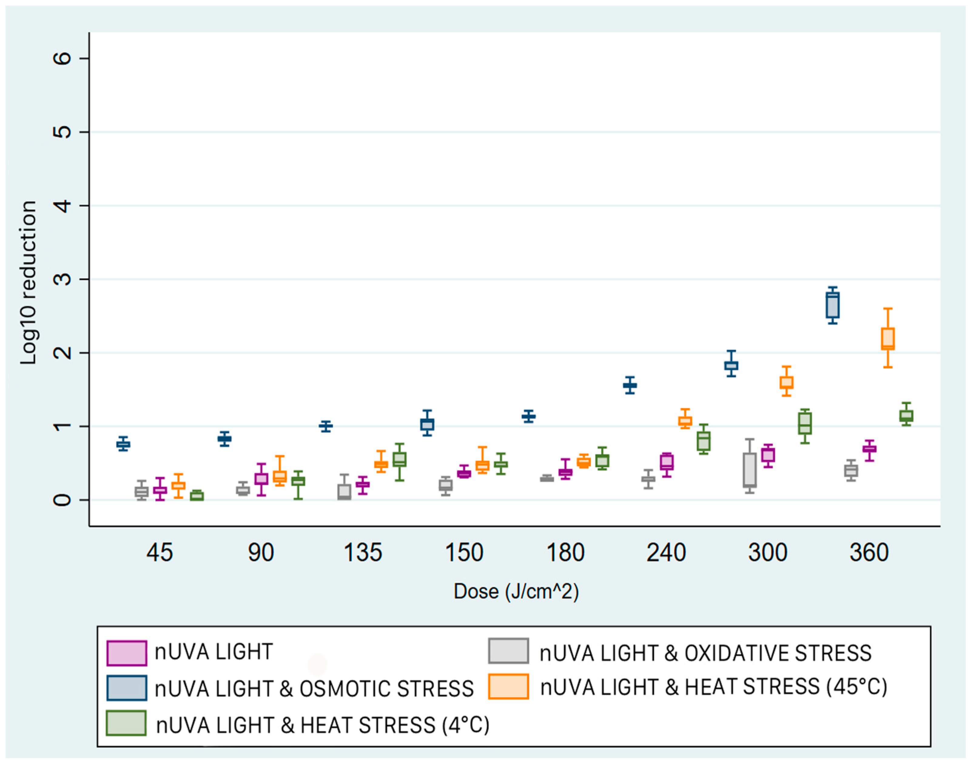 10 (IQR 1.10–1.86) at the highest energy dose. The level of reduction in microbial concentration increased with increasing energy dose. Exposure to near-UVA radiation alone was significantly less effective for this strain than combinations with sub-lethal stresses (