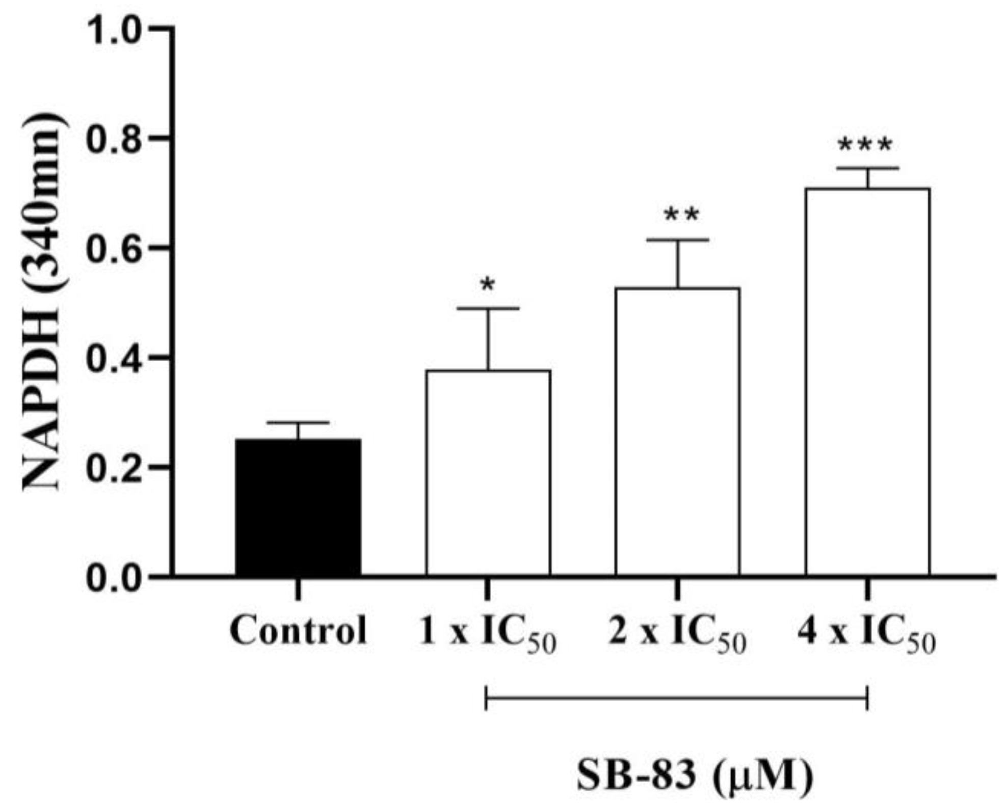 2.8. Evaluation of the Effect of SB-83 on Trypanothione Reductase (TR) Activity