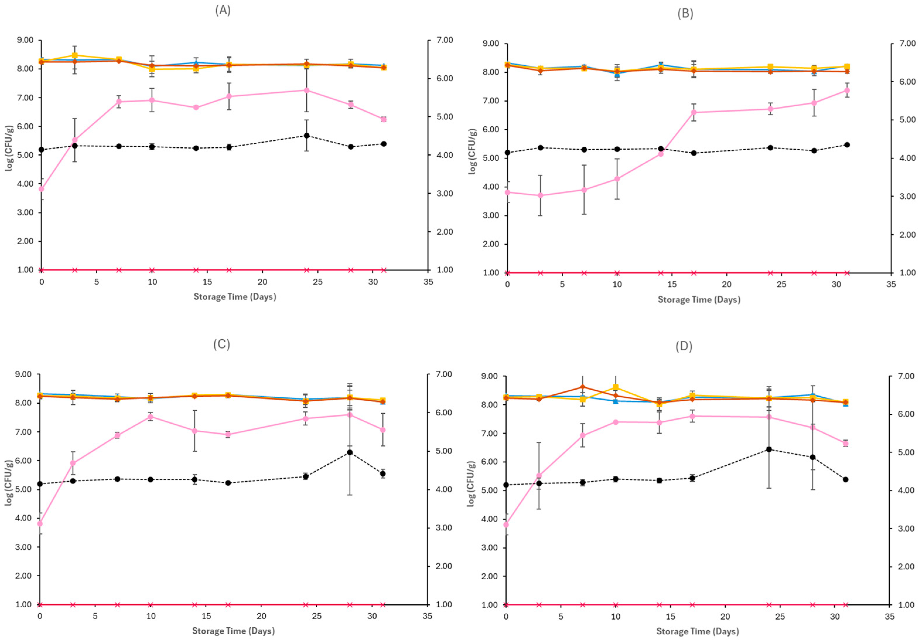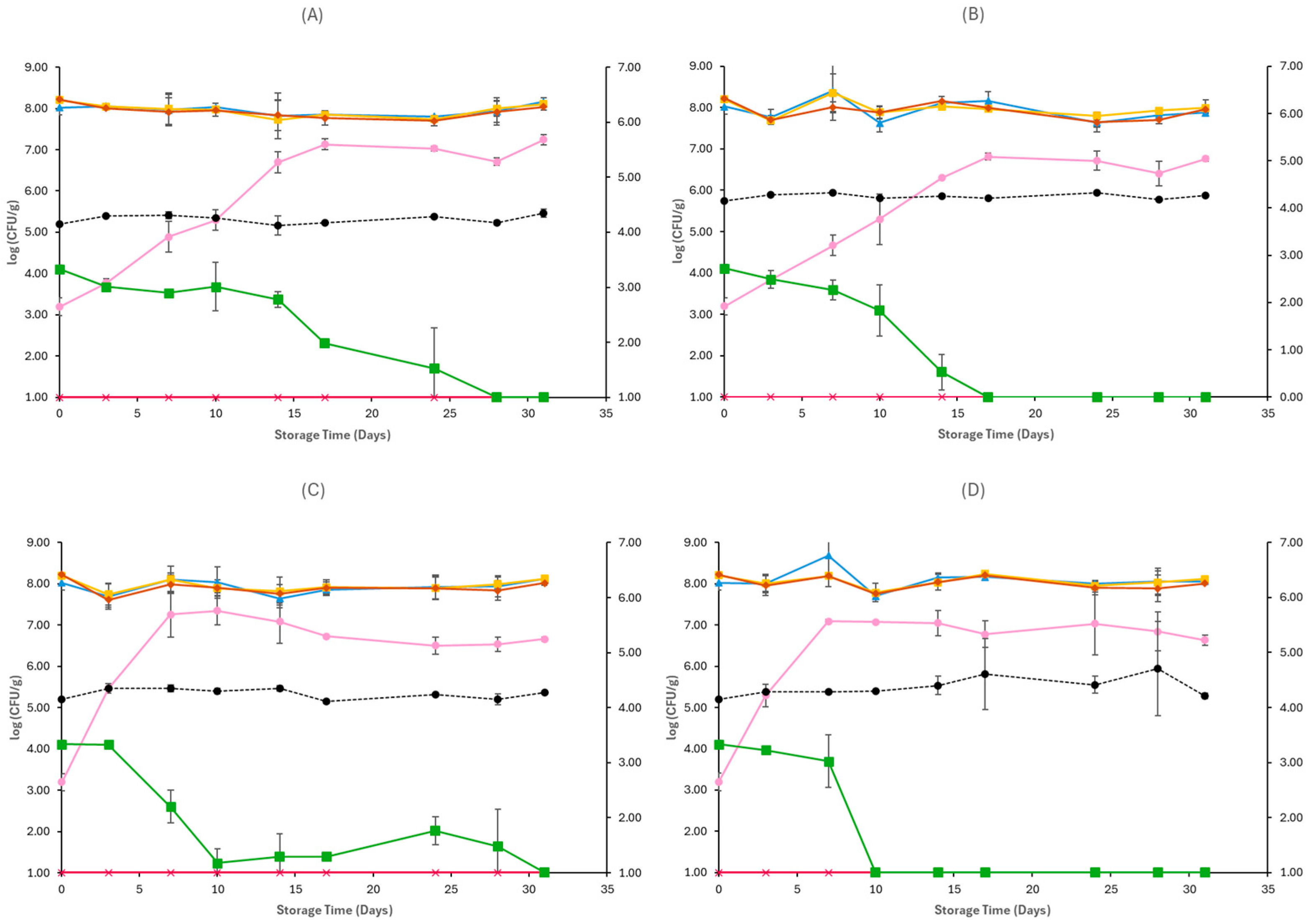 2.5. Microbiological Analyses and pH Measurements