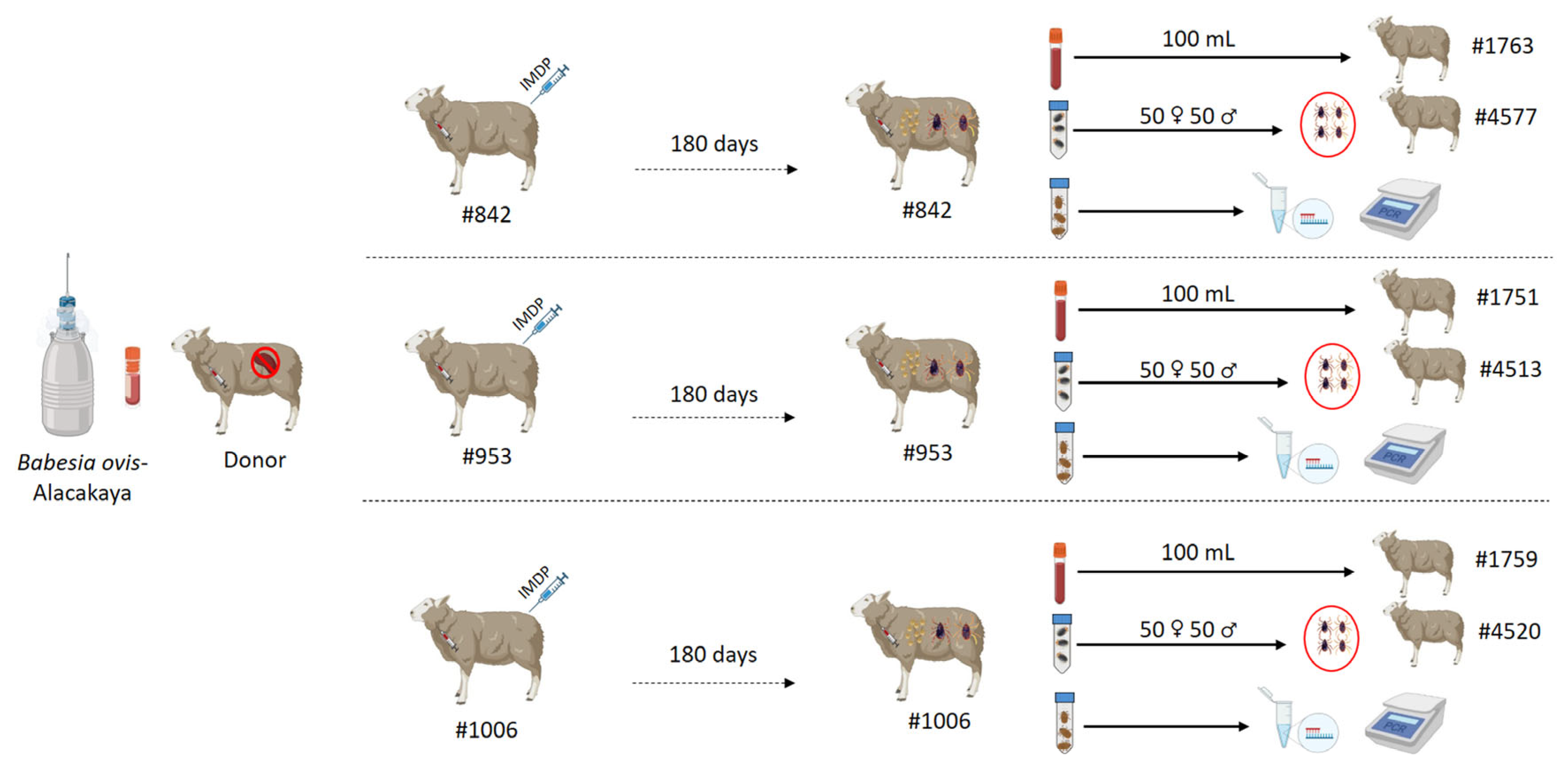 Firat, R.; Ulucesme, M.C.; Eyvaz, A.; Alatas, M.; Aktas, M.; Ceylan, O.; Sevinc, F.; Ozubek, S. Persistence and Transmission Dynamics of Babesia ovis After Imidocarb Dipropionate Treatment: Evaluation via Blood Transfusion and Tick Infestation. Pathogens 2026, 15, 7. https://doi.org/10.3390/pathogens15010007