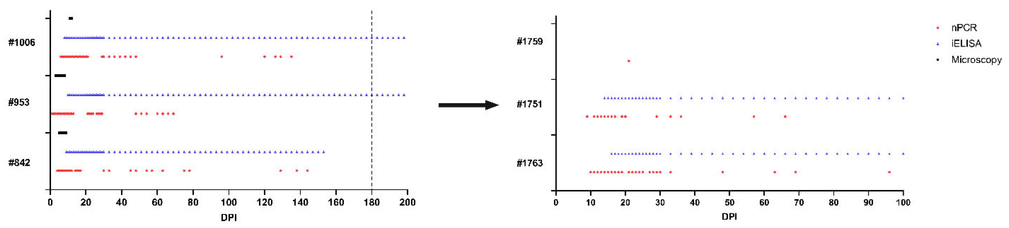 3.1. Clinical Progression and Treatment of Experimentally Infected Sheep