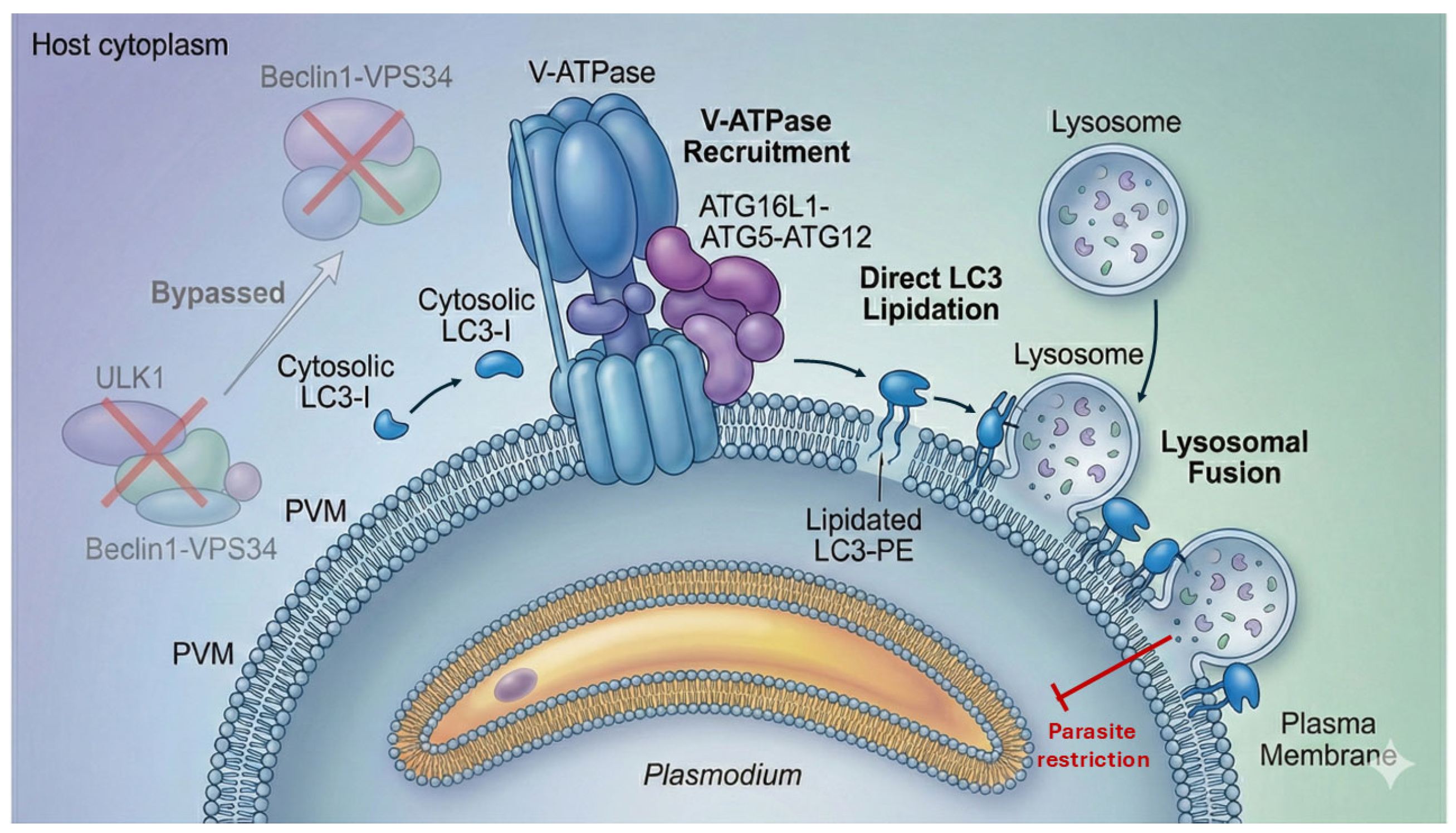 26]. Once formed, the PVM becomes the central interface for host–parasite interaction and a focal point for a specialized form of noncanonical autophagy, CASM. Recent work has shown that CASM—rather than canonical xenophagy—governs LC3 recruitment to the PVM through V-ATPase–ATG16L1-dependent lipidation, constituting a major hepatocyte-intrinsic defense mechanism during early liver-stage infection [