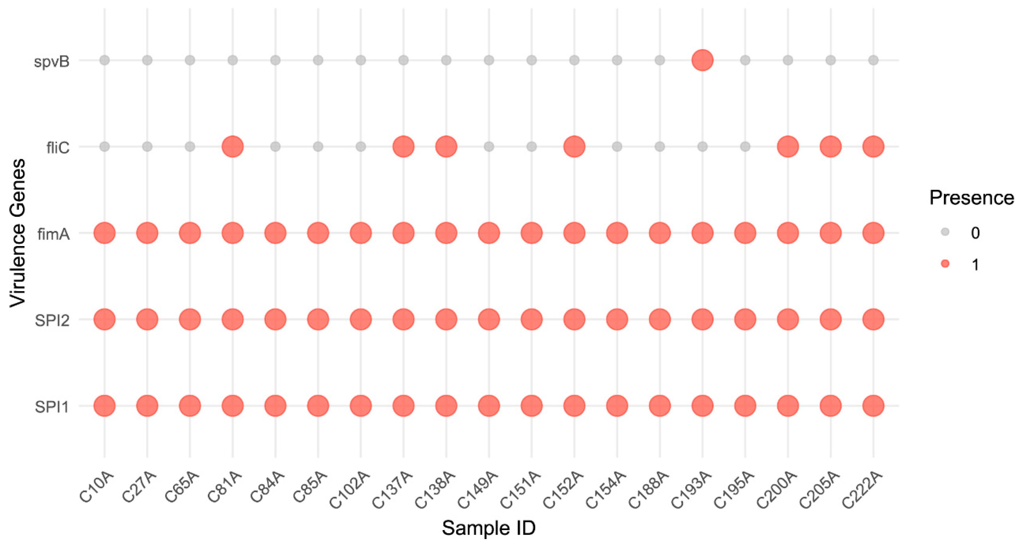 - Pavon, R.D.N.; Mendoza, P.D.G.; Flores, C.A.R.; Calayag, A.M.B.; Rivera, W.L. Genotypic Virulence Profiles and Associations in Salmonella Isolated from Meat Samples in Wet Markets and Abattoirs of Metro Manila, Philippines. BMC Microbiol. 2022, 22, 292. [Google Scholar] [CrossRef]