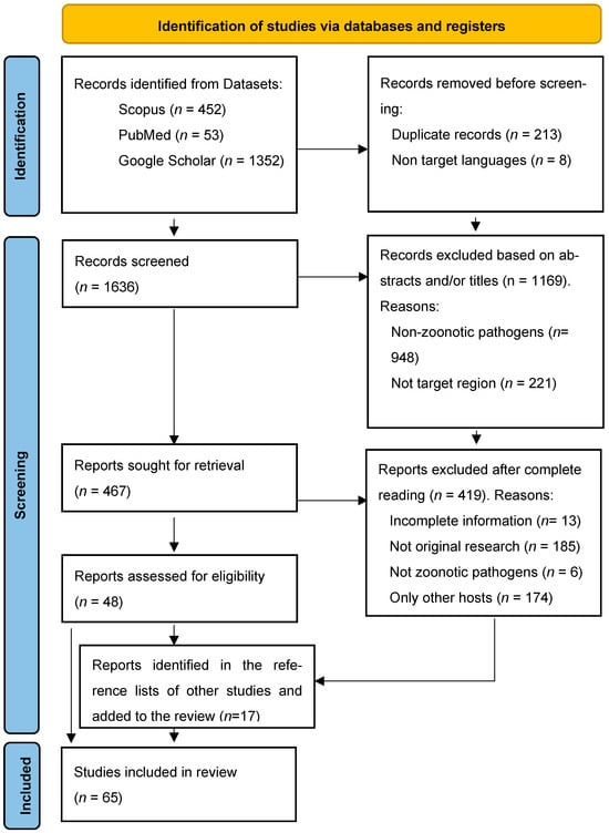 Records were excluded if they met any of the following criteria: duplicate entries retrieved from multiple databases (Duplicate records); articles not published in the predefined target languages (Non-target languages); studies conducted outside the predefined geographic scope (Amazon basin and peripheral area) (Non-target region); studies investigating host species other than dogs and cats (Non-target species); articles not addressing pathogens transmissible among animals and humans (Non-zoonotic pathogens); studies lacking sufficient methodological detail or extractable data to allow critical appraisal or to provide a clear estimate of pathogen prevalence (Incomplete information); or publications that did not report original primary research data (Non-original research).