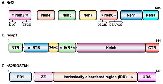 Domain structures of key proteins in oxidative stress signaling. (A) Nrf2 domain structure. Asterisks in Neh2 domain represent the two conserved sequence motifs that interact with Keap1 while those in the Neh6 domain represent motifs that are recognized by E3 ubiquitin ligase b-TrCP. (B) Keap1 domain structure. Asterisks in the BTB (C151) and IVR (C226, C273, and C288) domains represent cysteine residues that are targets of modification in response to oxidative stress. (C) p62/SQSTM1 domain structure. The asterisk in the intrinsically disordered region represents the Keap1 binding domain.